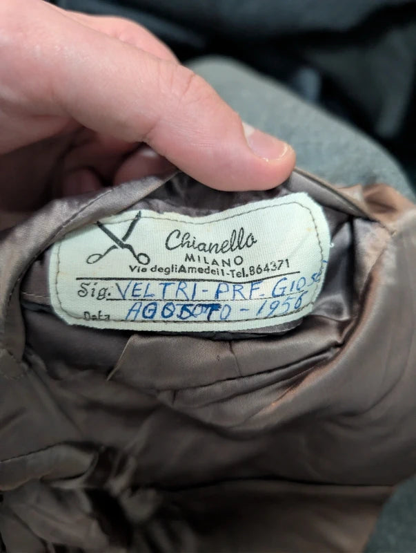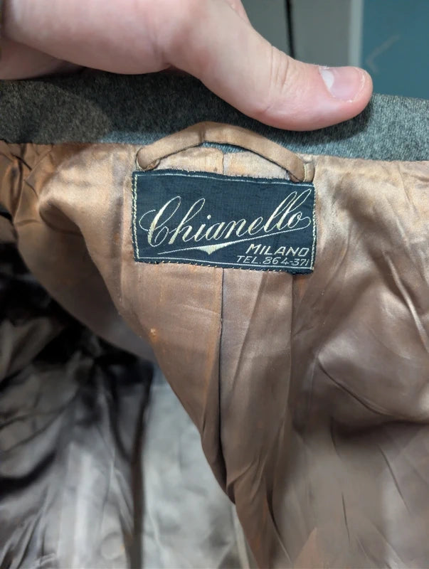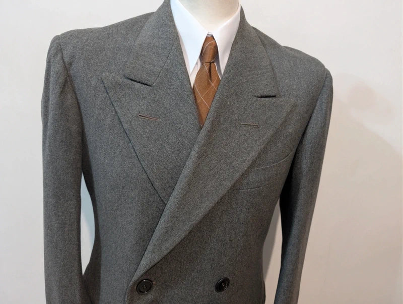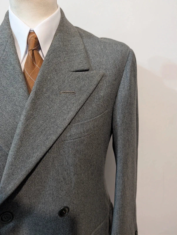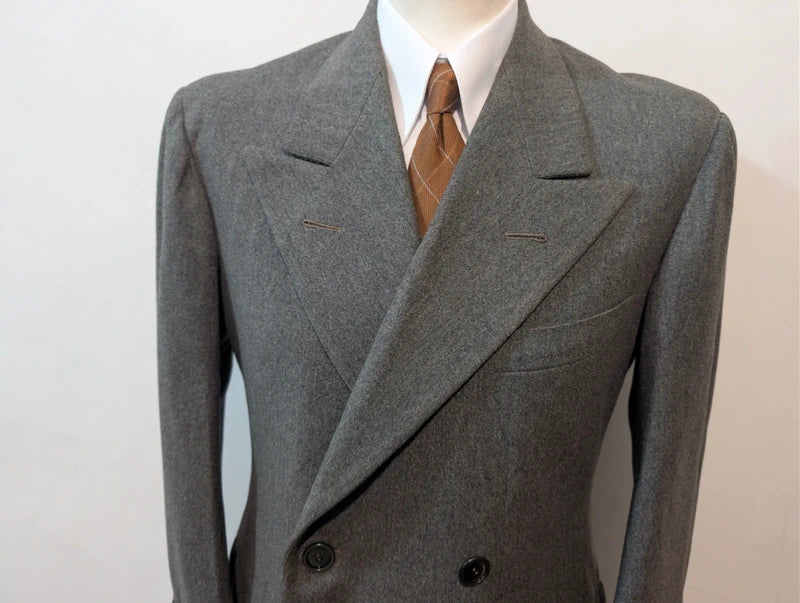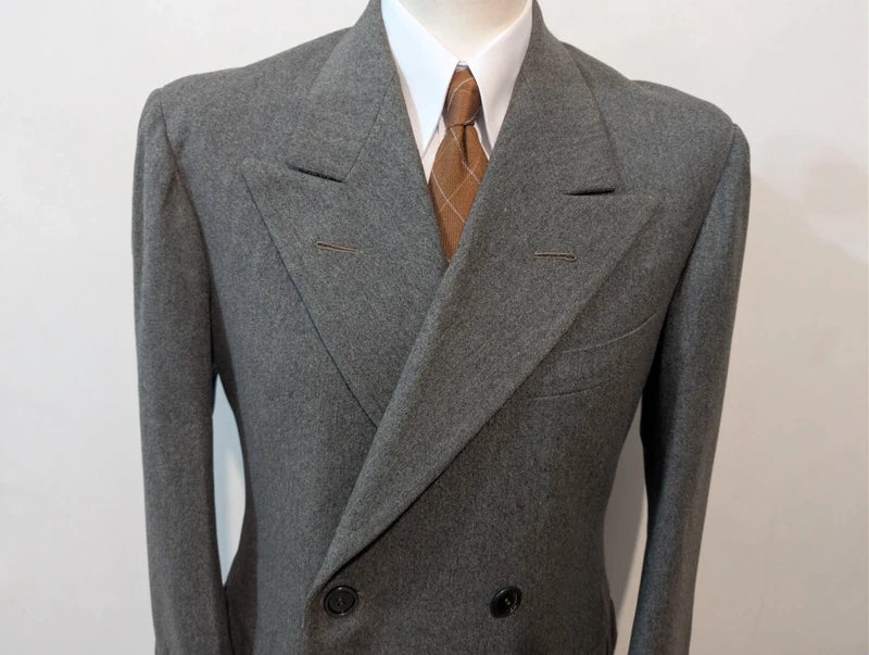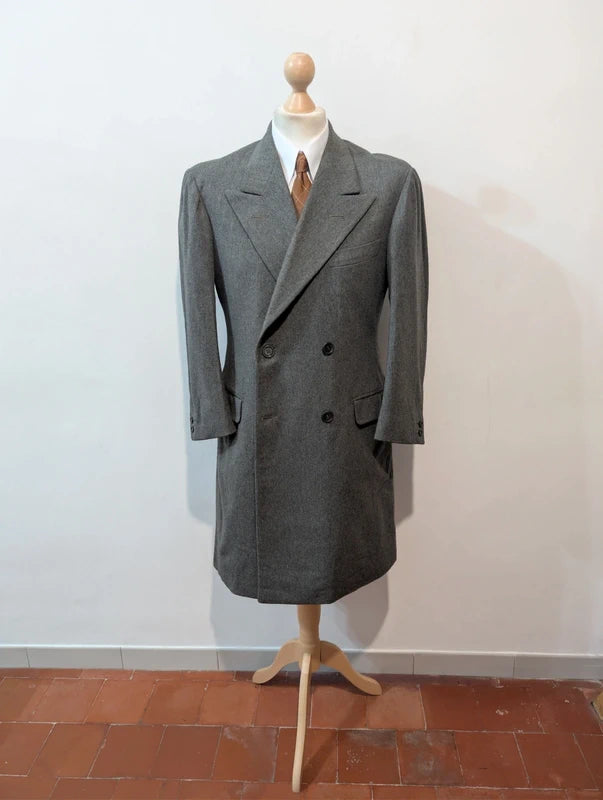 Ich biete Ihnen diesen alten, zweireihigen Mantel aus grauer Wolle an.