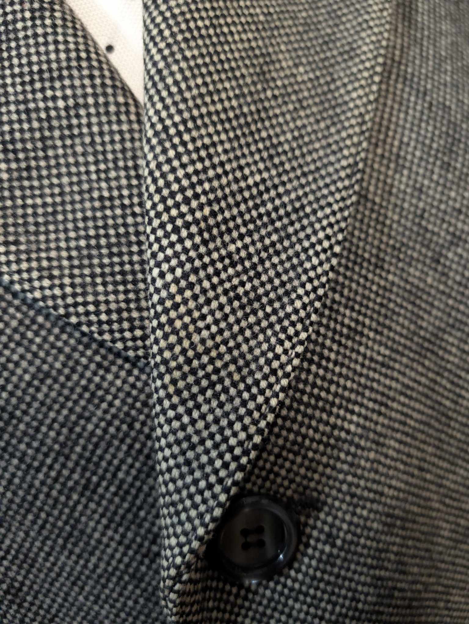 Ich biete Ihnen diesen alten, graumelierten Wollmantel an.