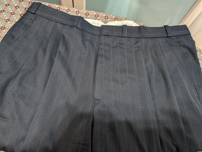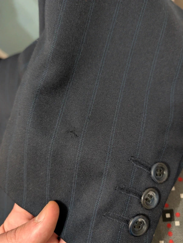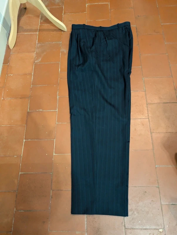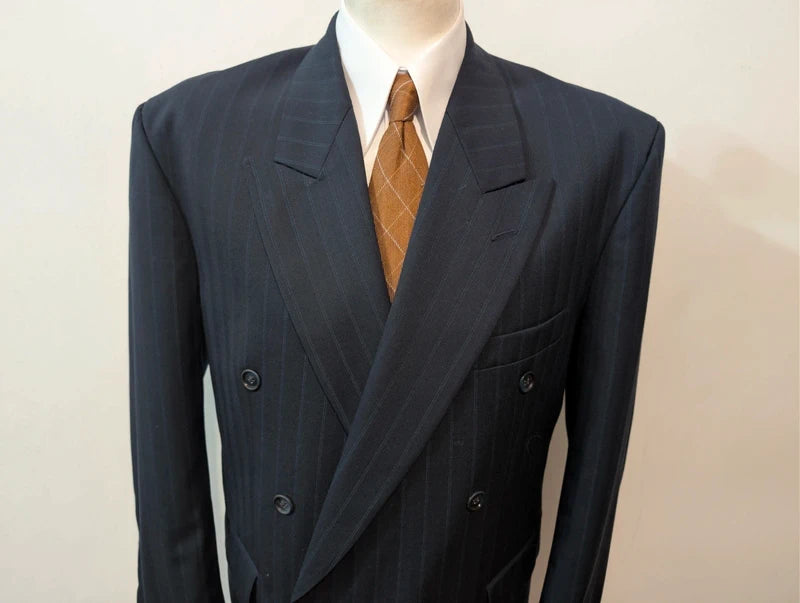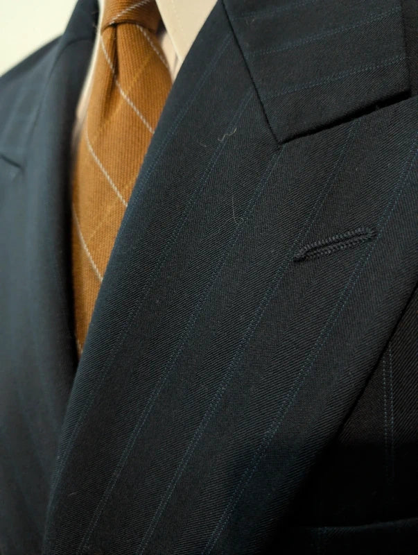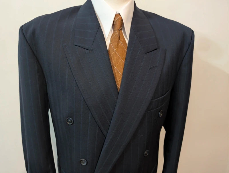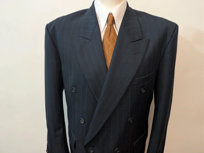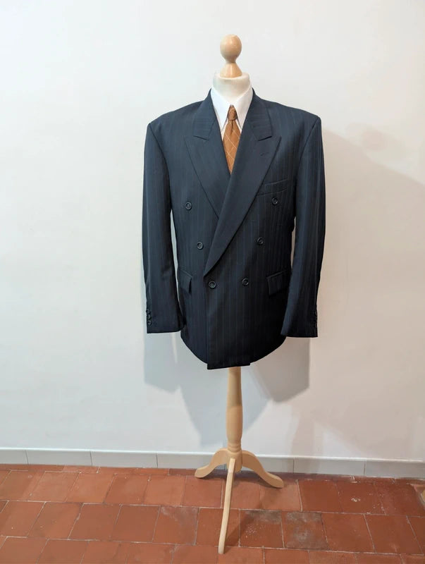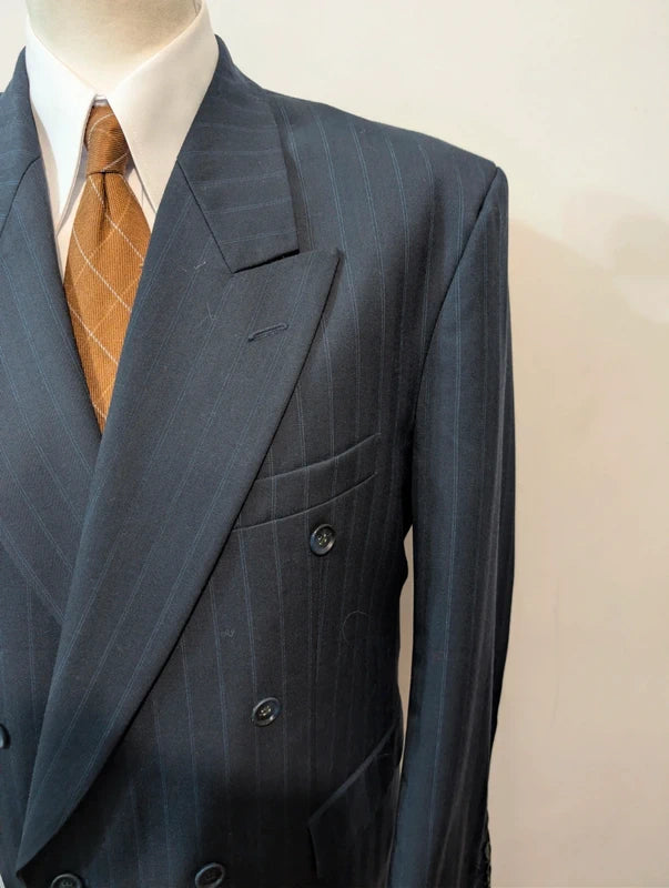 Ich empfehle diesen schönen, zweireihigen Anzug in Marineblau mit Wollstreifen.