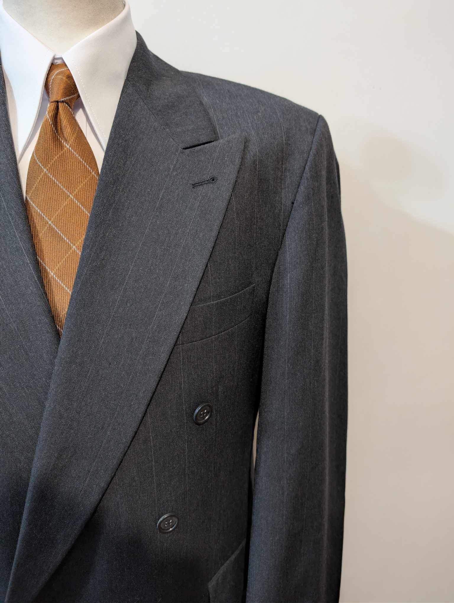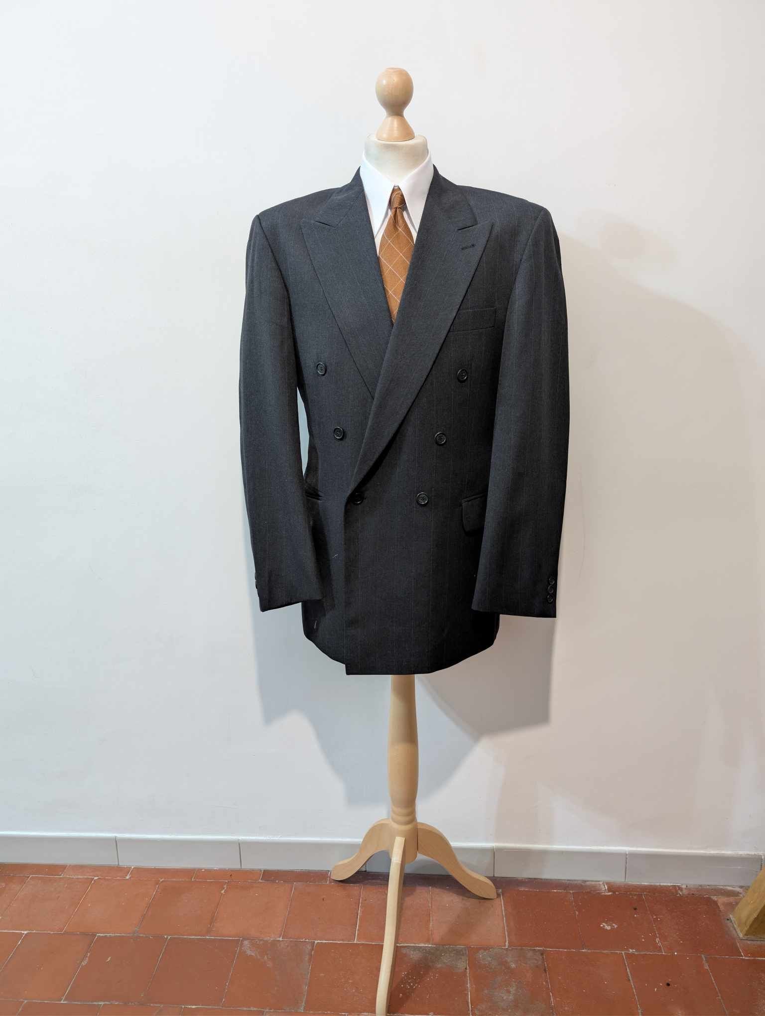 Je vous propose ce classique costume croisé pinstripe de couleur gris en laine.