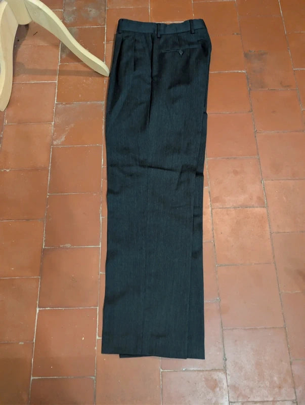 Die Hose selbst ist eine weite Hose mit doppelten Bundfalten und hohem Bund.