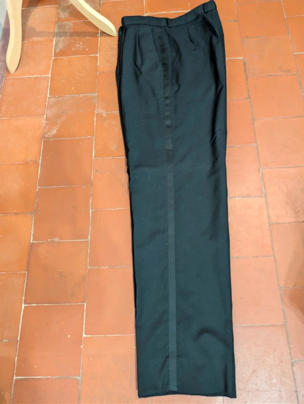 Ich biete Ihnen diesen klassischen, zweireihigen Smoking in Schwarz aus kühler Wolle an.
