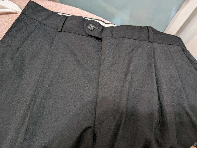 Die Hose hingegen ist eine weite Hose mit doppelten Bundfalten und einem sehr hohen Bund.