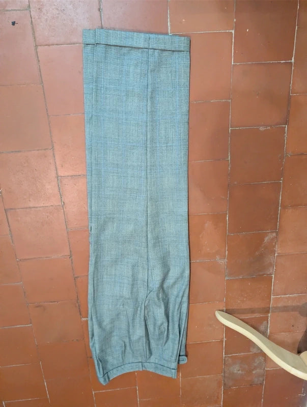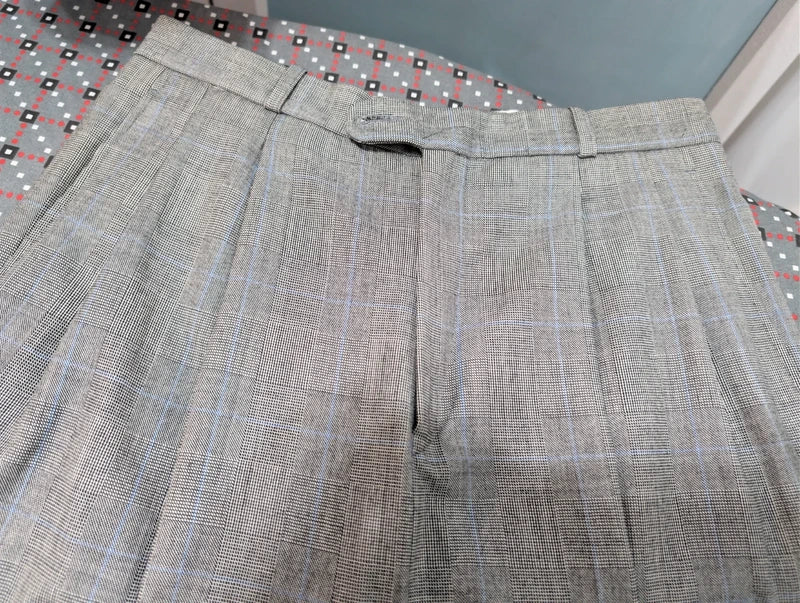 Die Hose hingegen ist eine weite Hose mit doppelten Bundfalten und einem sehr hohen Bund.