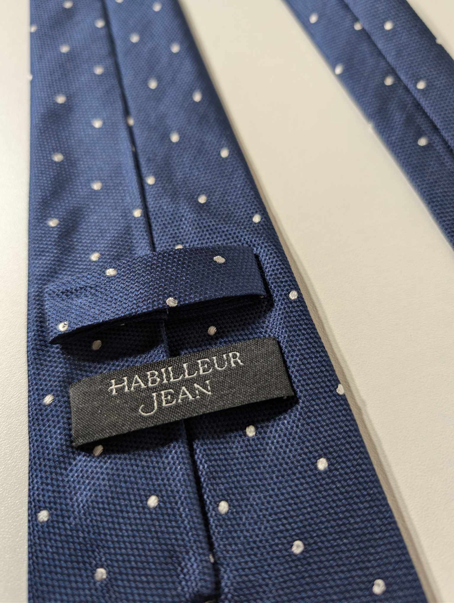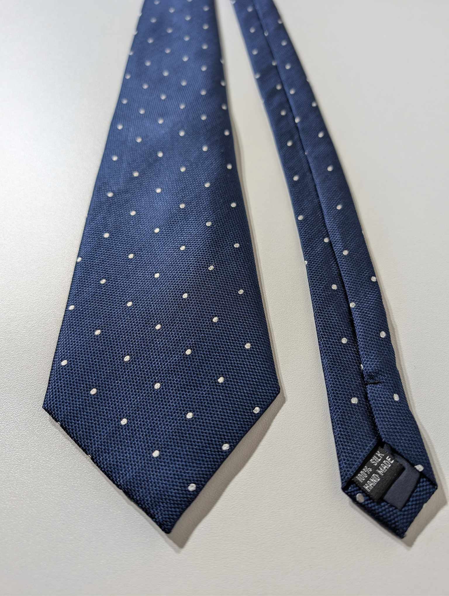 Es ist marineblau und hat ein Seiden-Tupfenmuster.