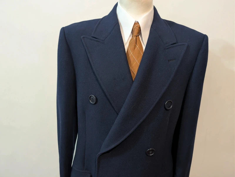 Eleganter, marineblauer, zweireihiger Wollmantel