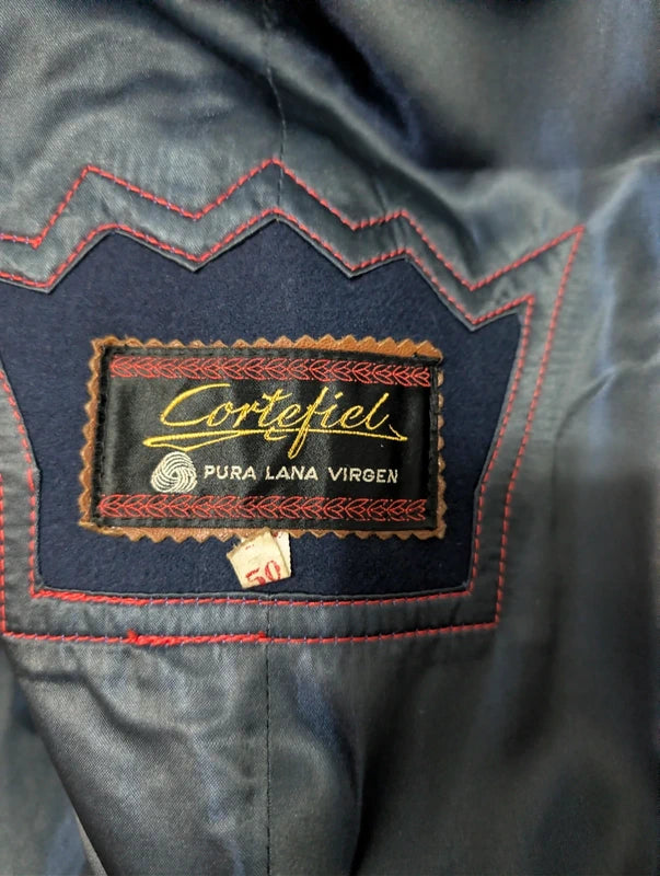 Ich biete Ihnen diesen eleganten, zweireihigen Mantel aus marineblauer Wolle an.