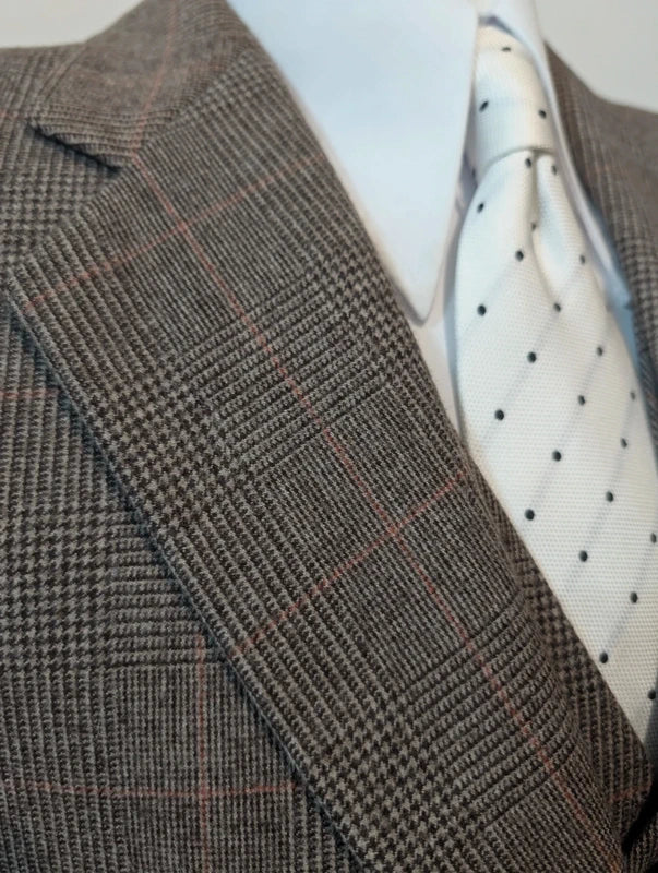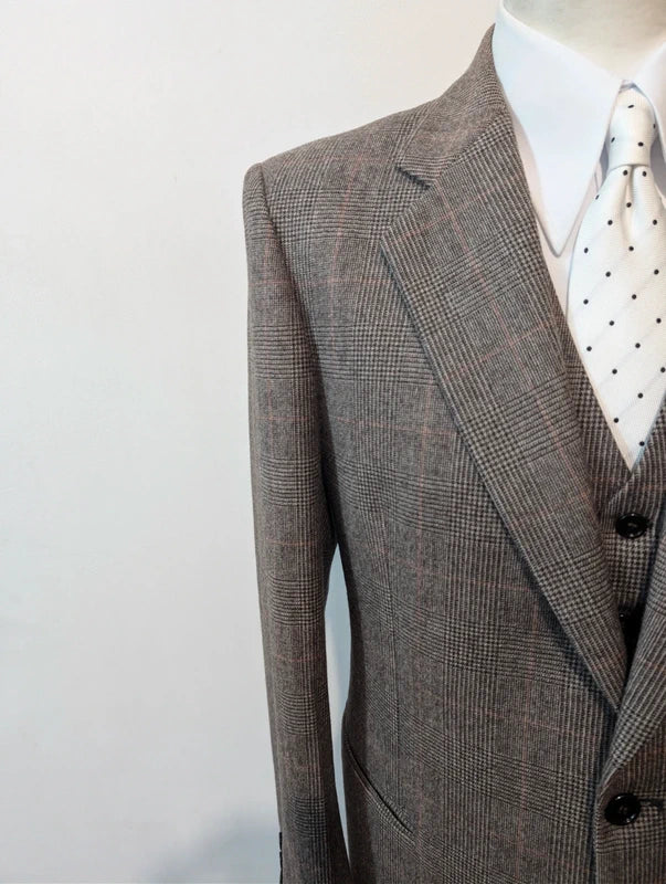Je vous propose ce fabuleux costumes 3 pièces de couleur gris marron à motif prince de Galles en flanelle lourdes.