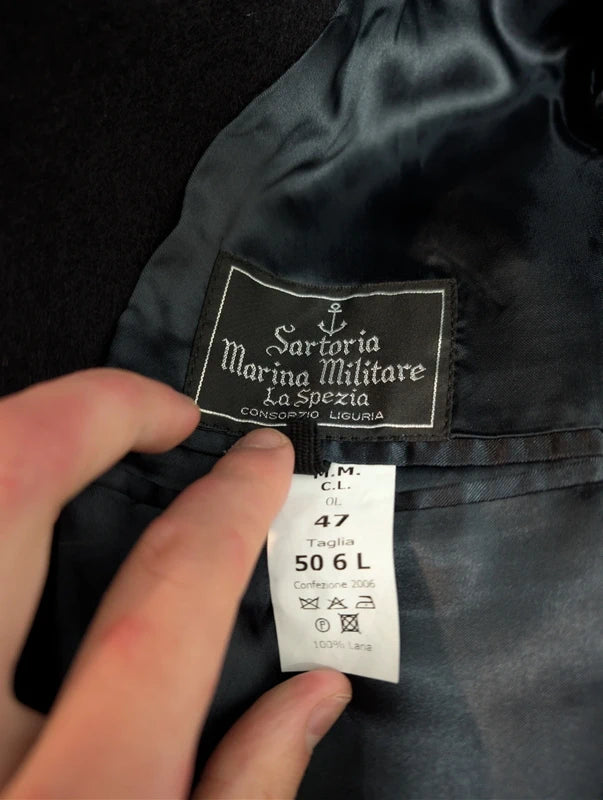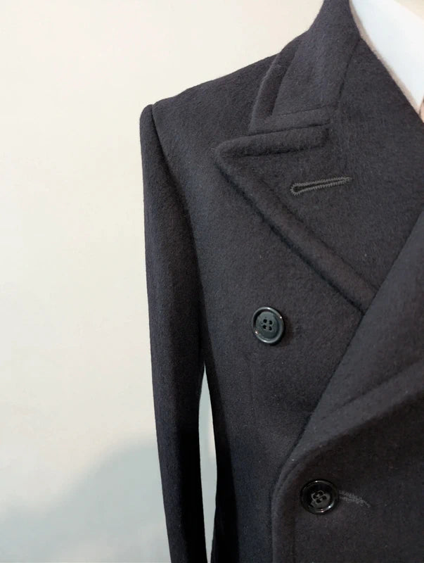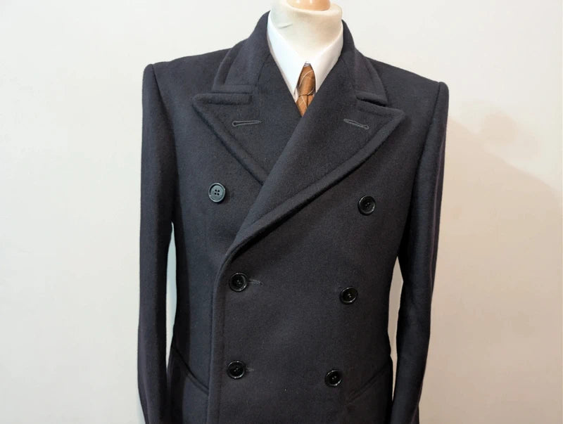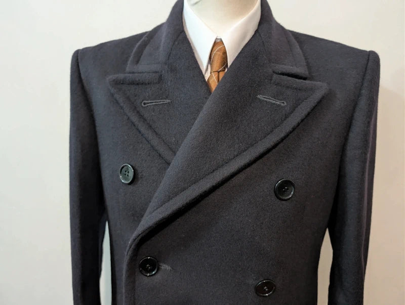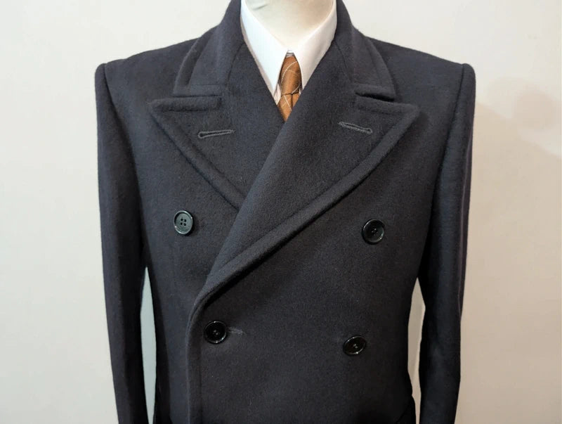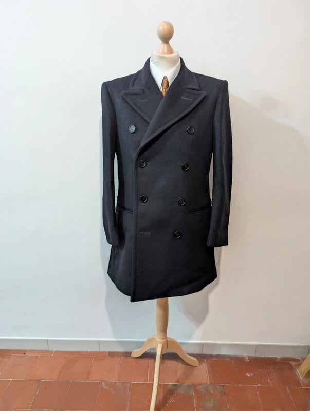 Ich biete Ihnen diesen fantastischen, zweireihigen Mantel in Marineblau an, gefertigt aus italienischer Marinewolle.