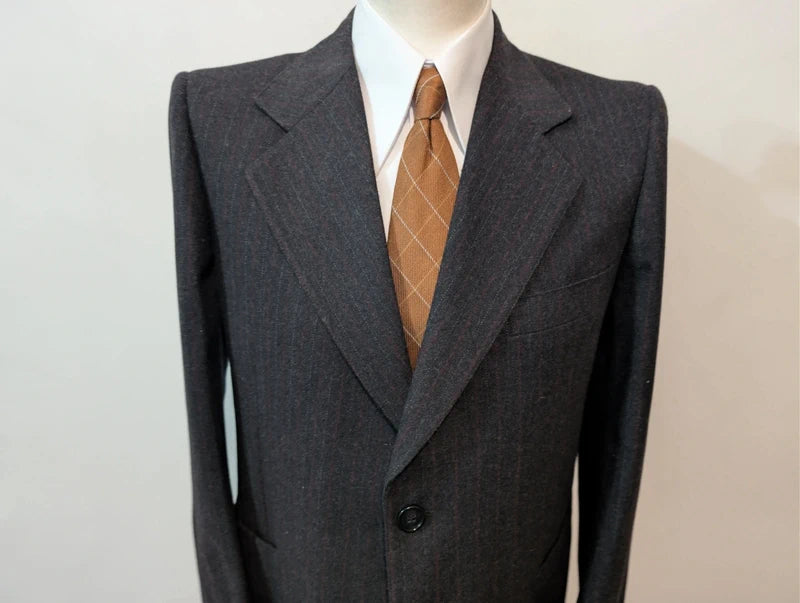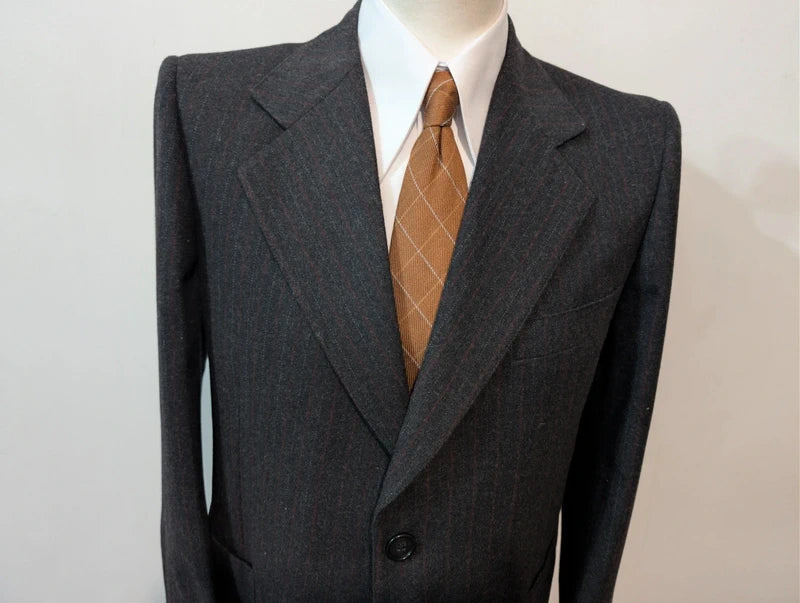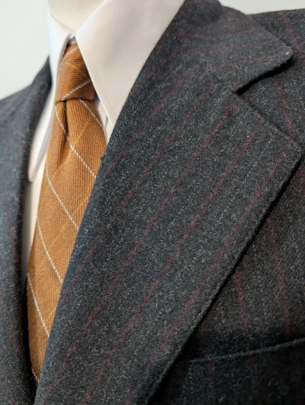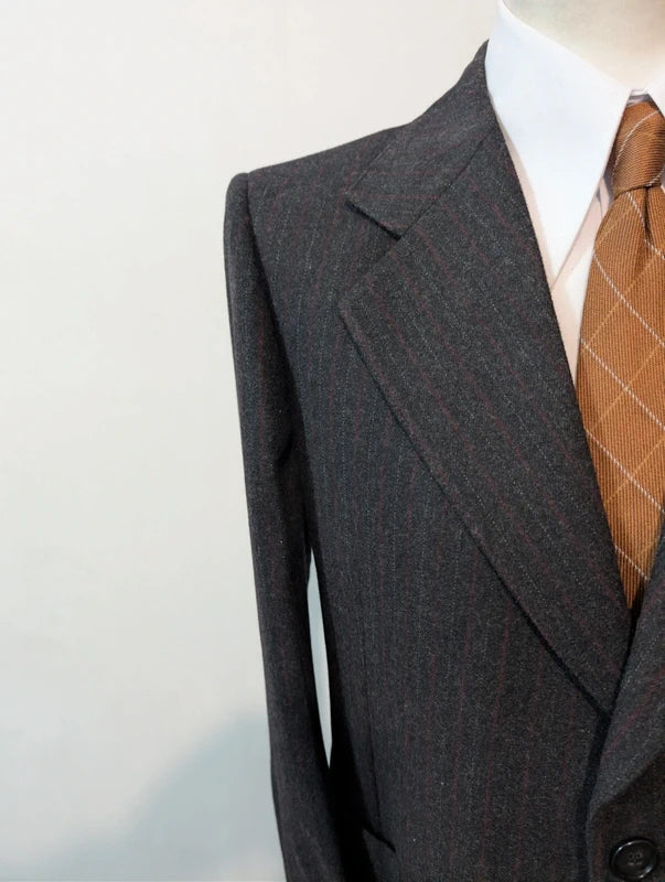 Ich präsentiere Ihnen diesen auffälligen Kreidestreifenanzug in Grau mit breiten weißen und roten Flanellstreifen.