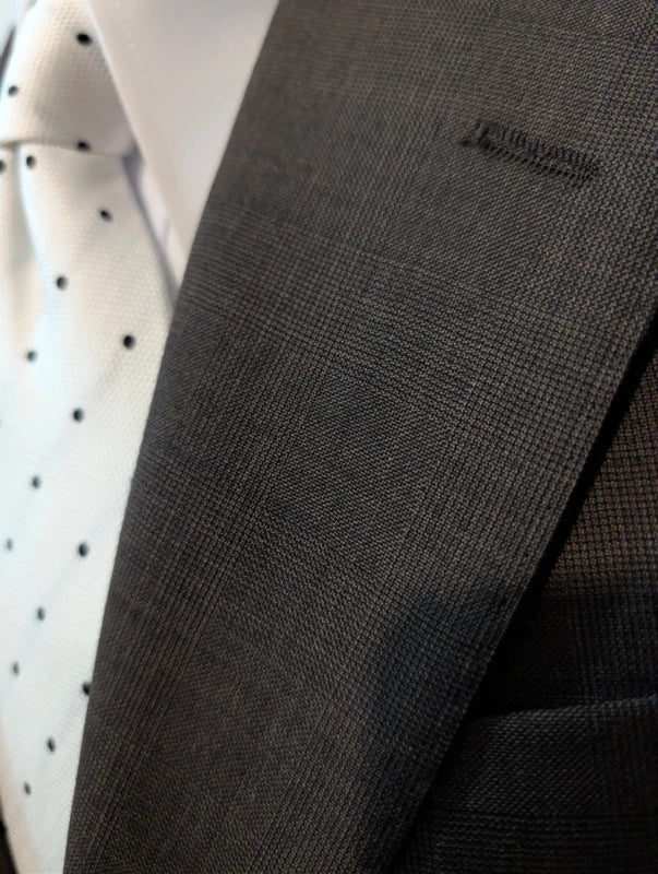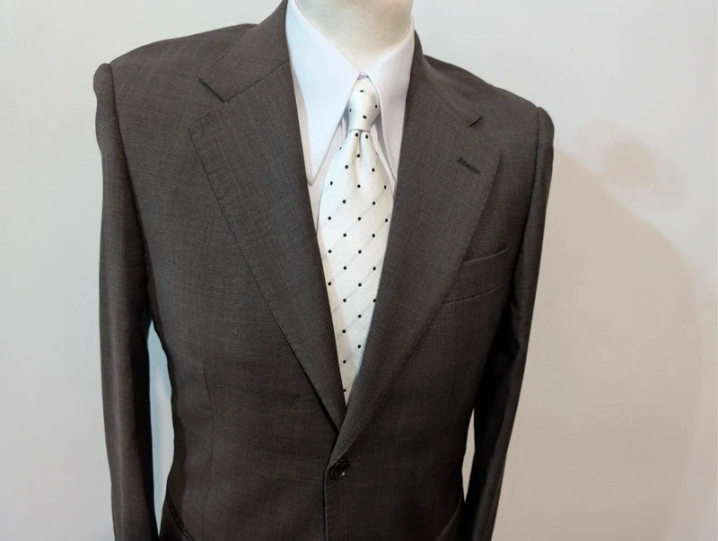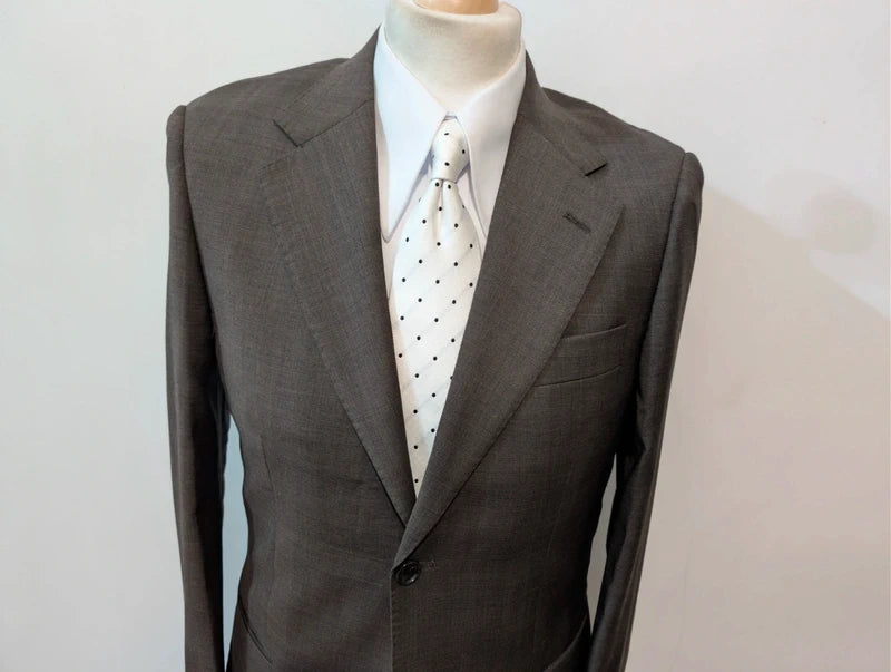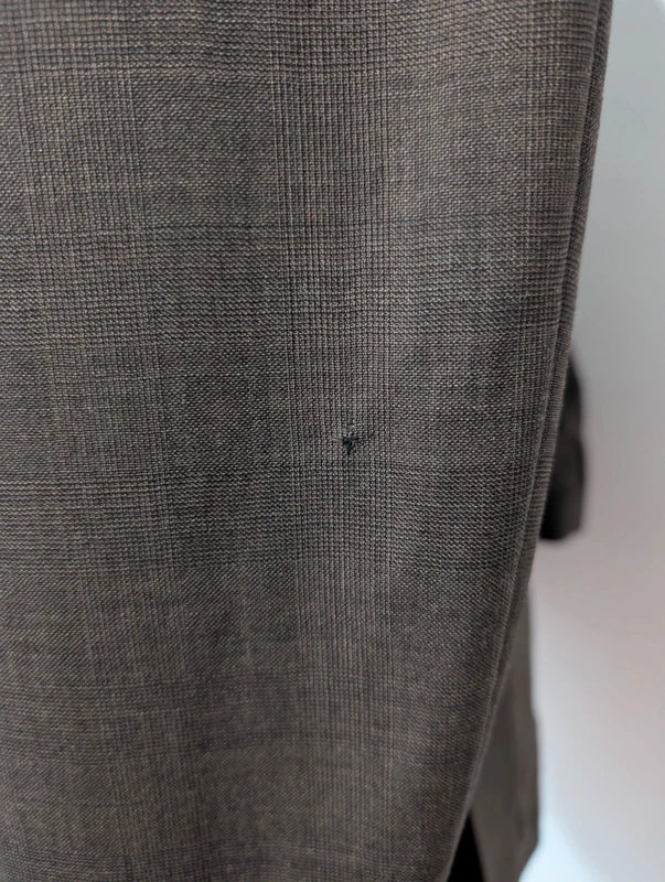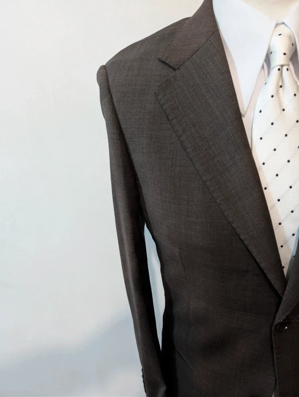 Ich biete Ihnen diesen fantastischen braunen Wollanzug mit kleinem Karomuster an.