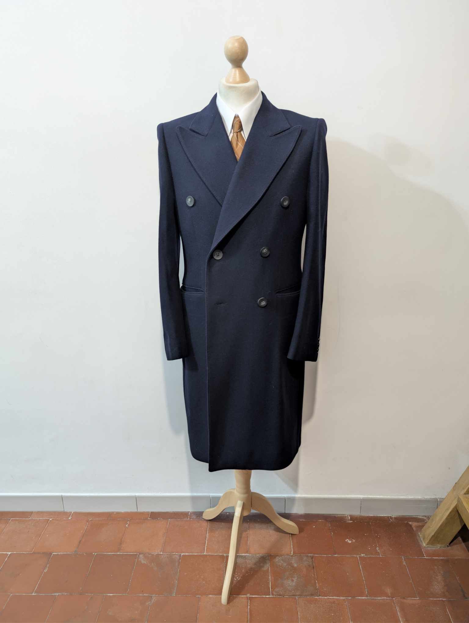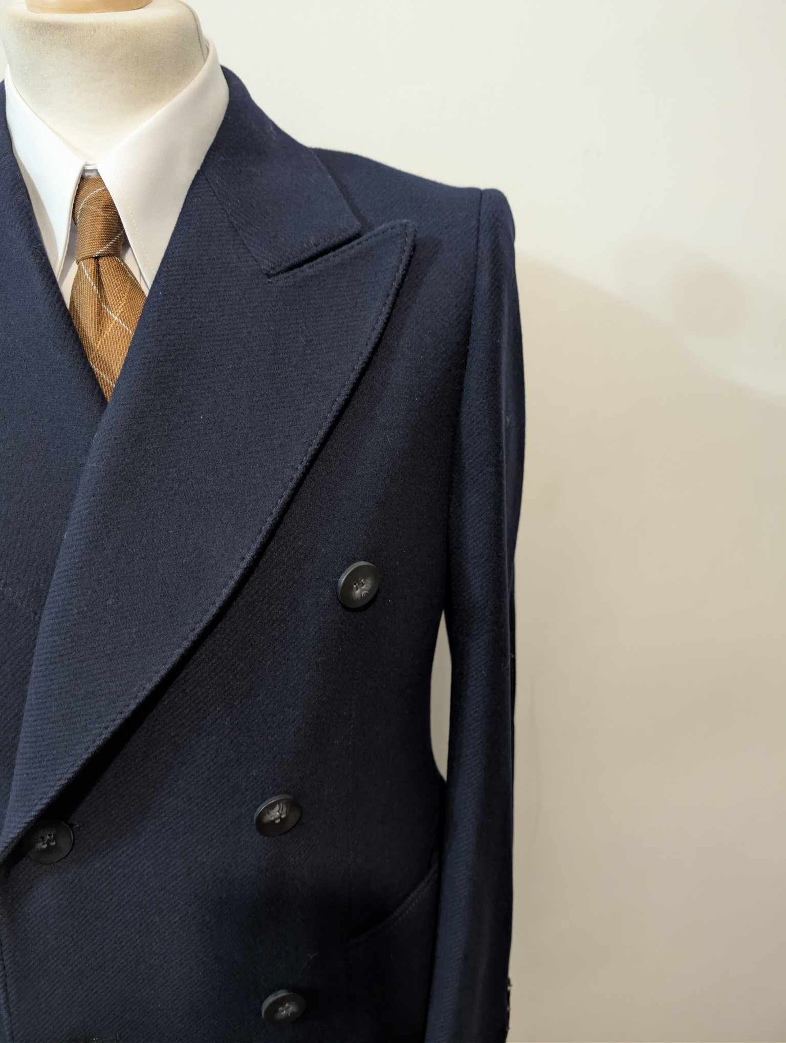 Der Mantel ist ein 6x2 großer, zweireihiger Mantel mit prächtigen, spitz zulaufenden Revers.