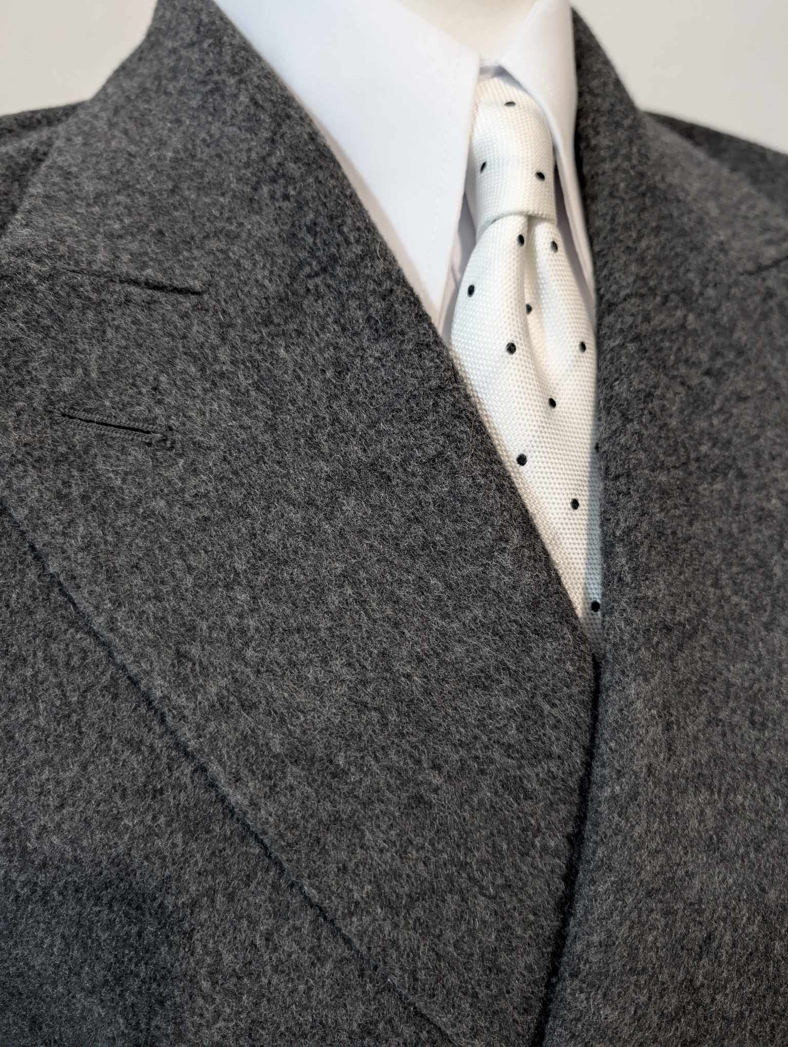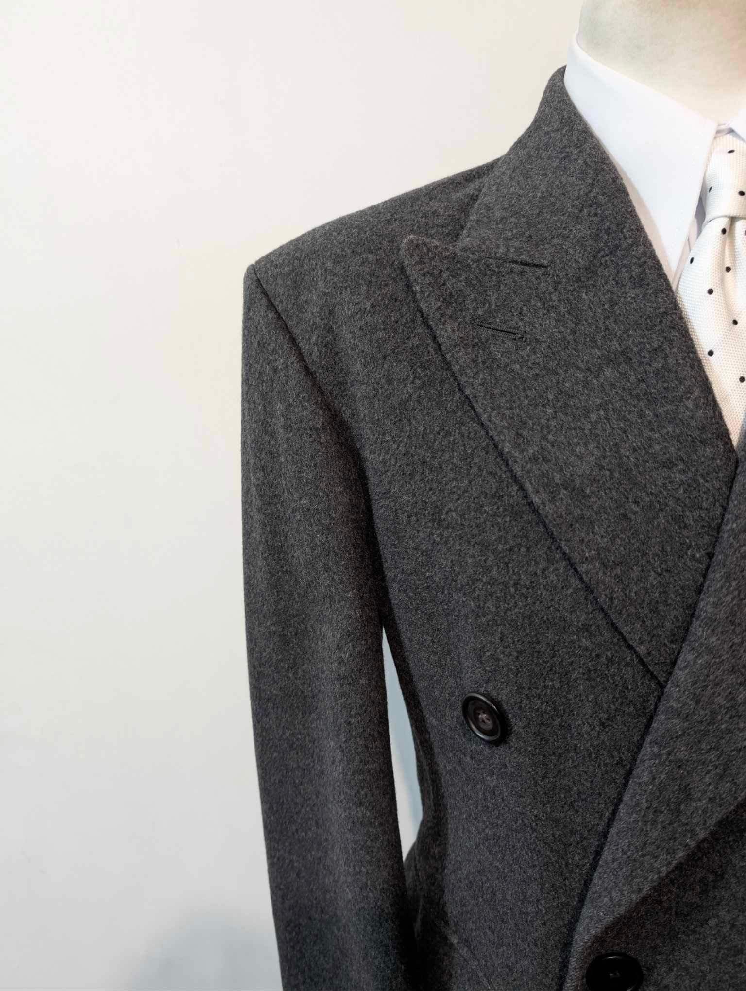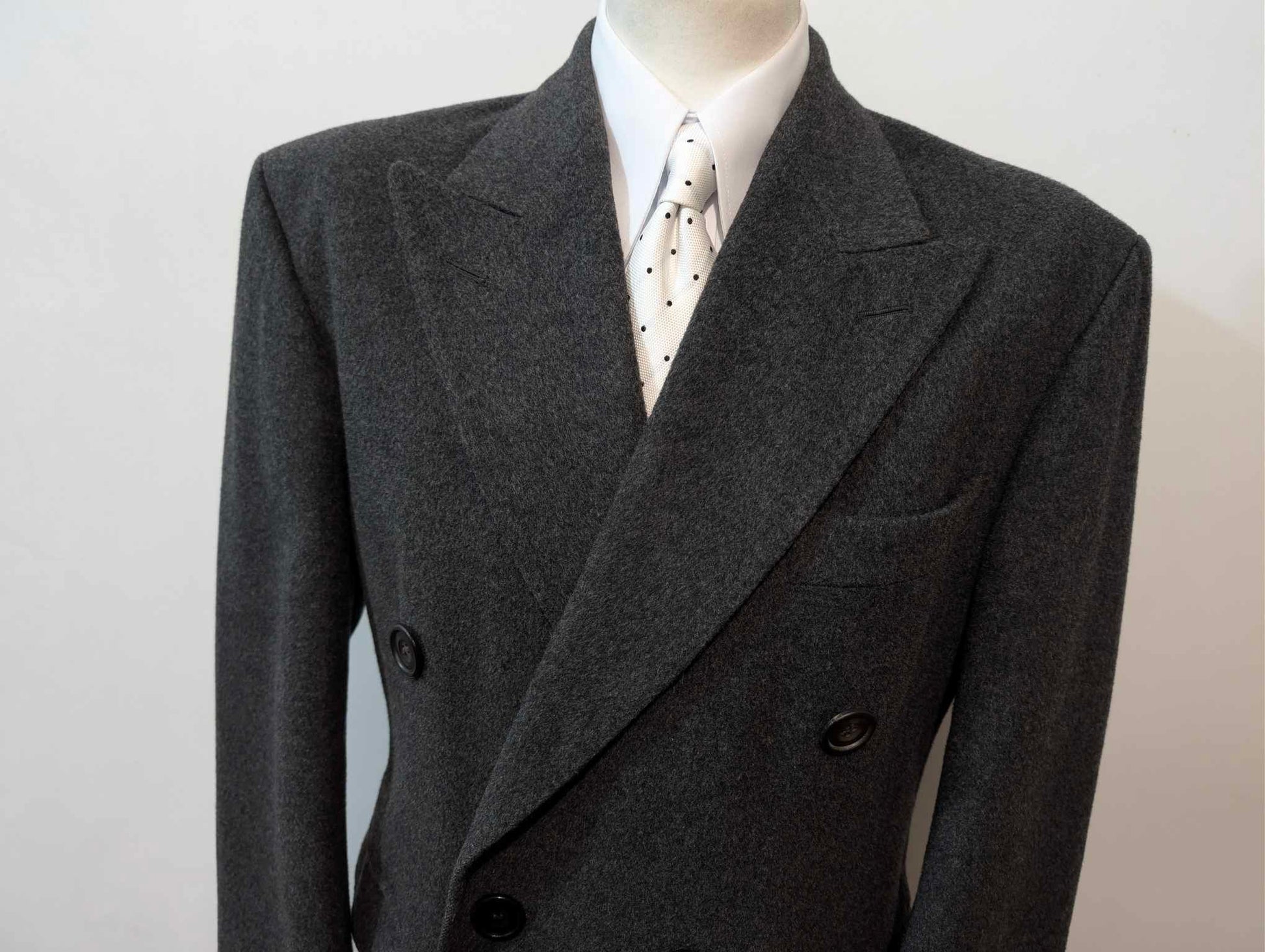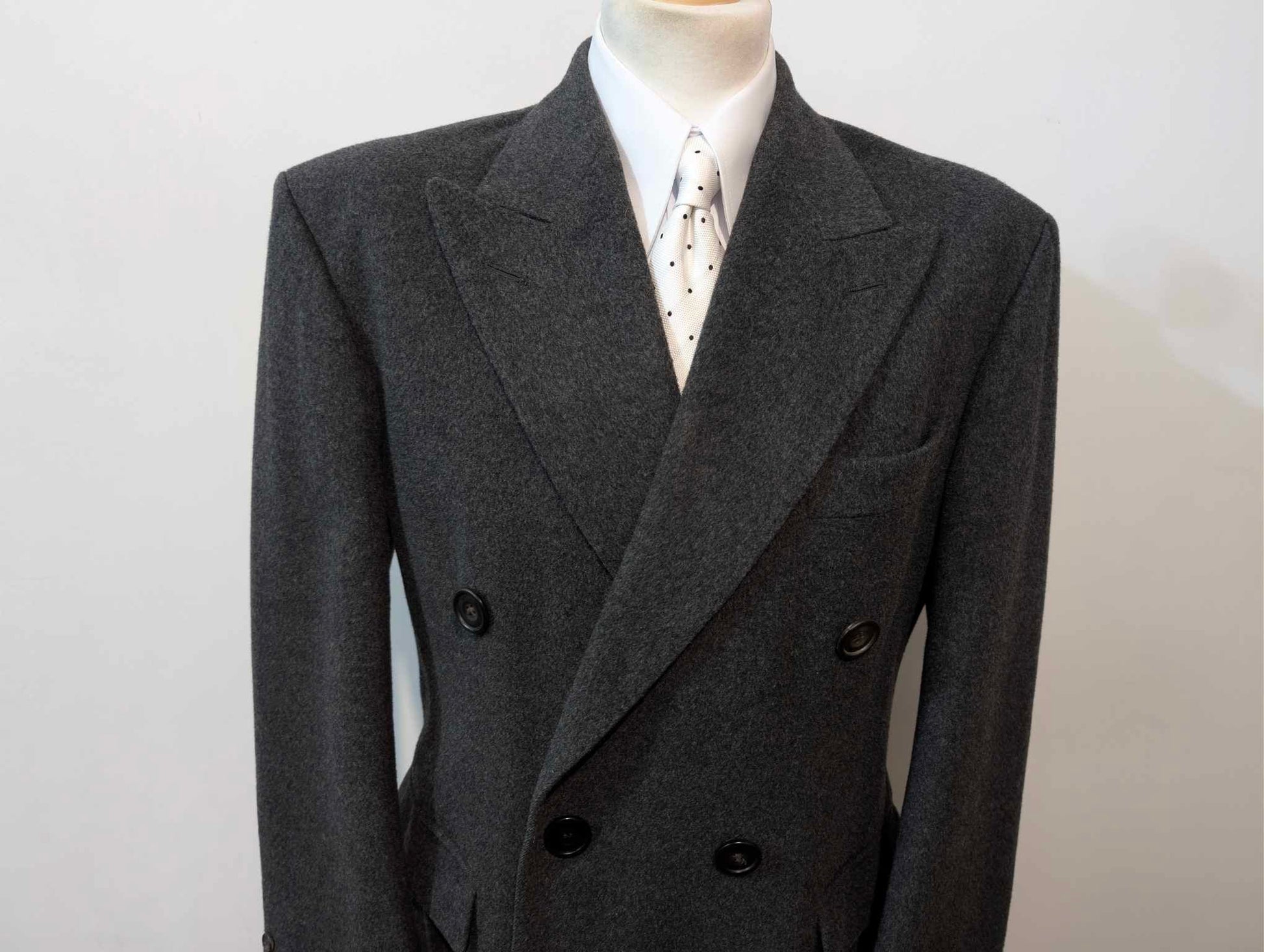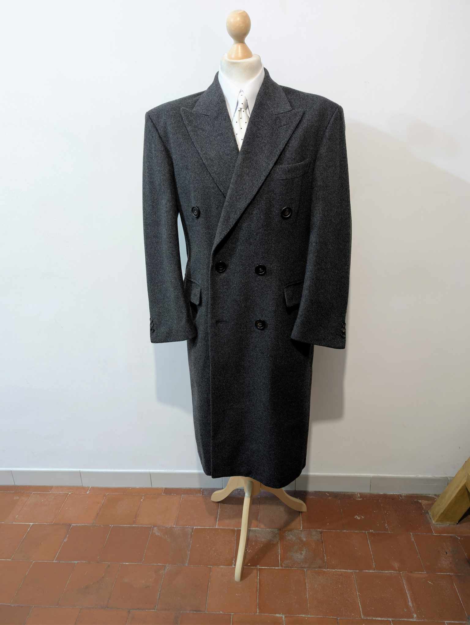 Der Mantel ist ein 6 x 2 zweireihiger Mantel mit wunderschönen spitzen Revers.
