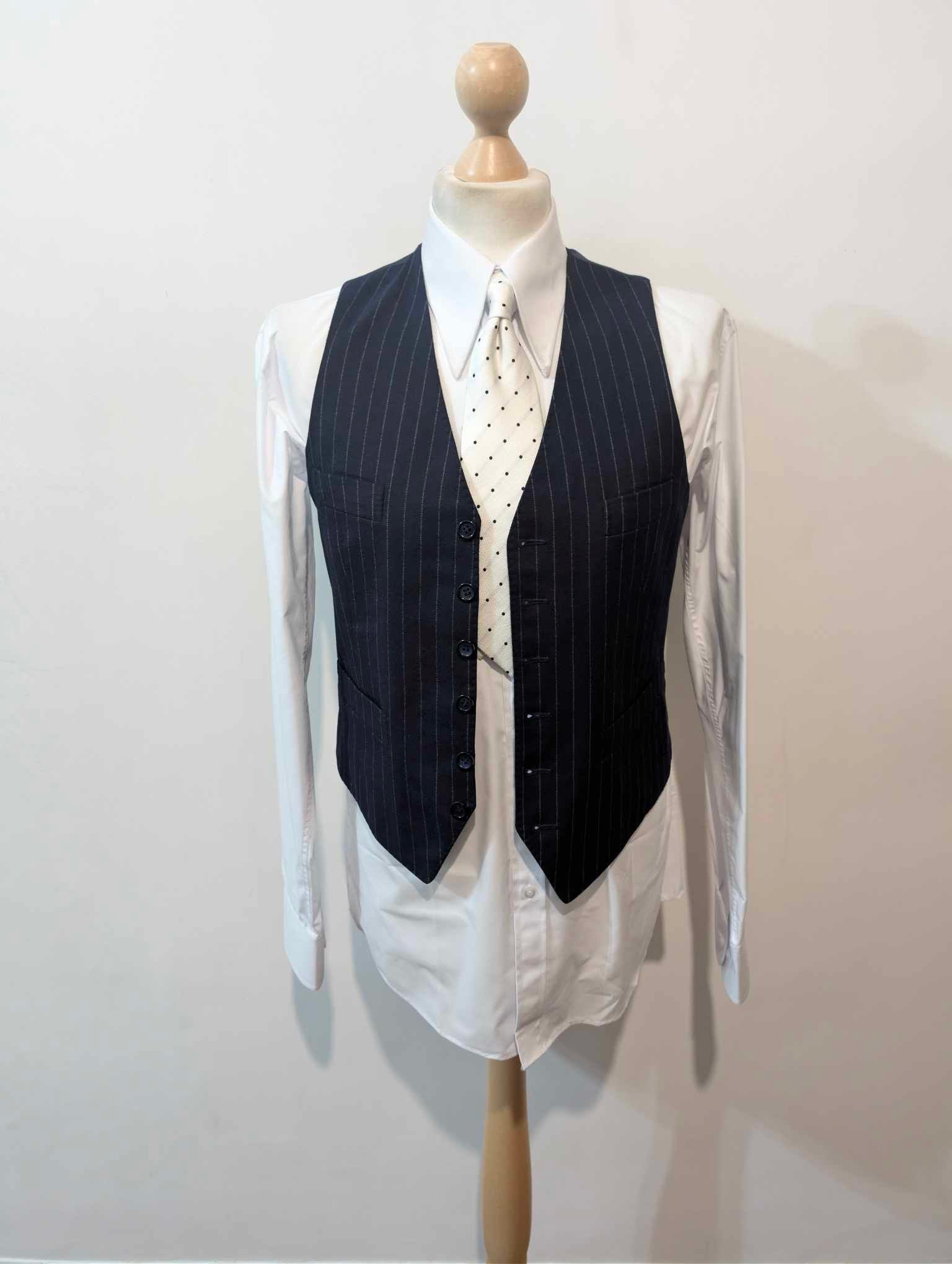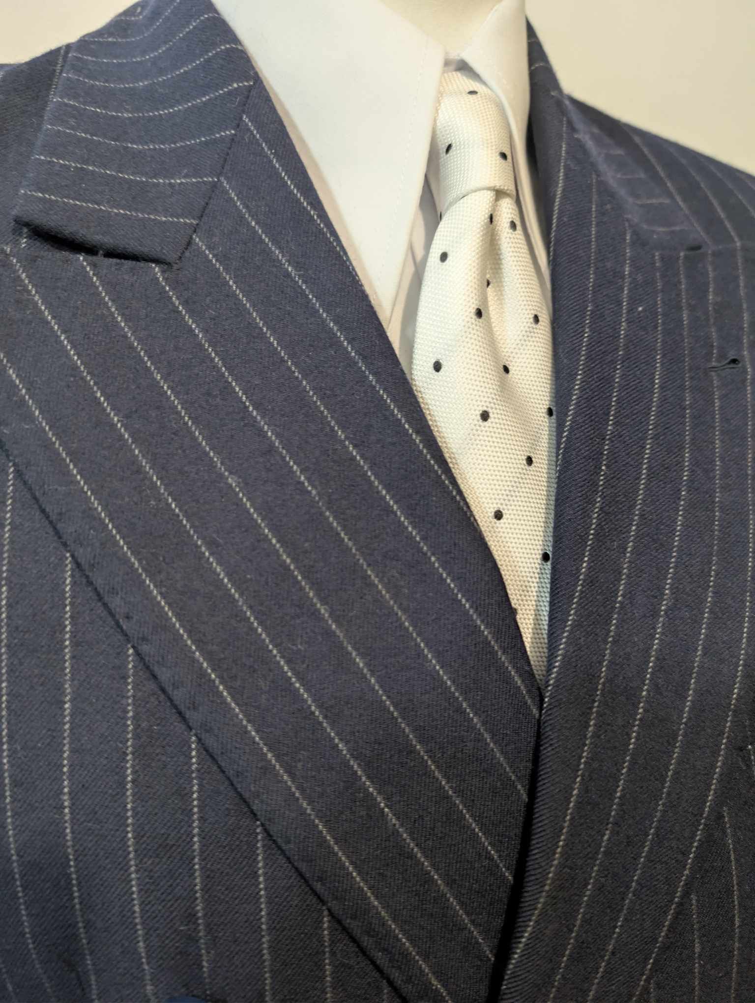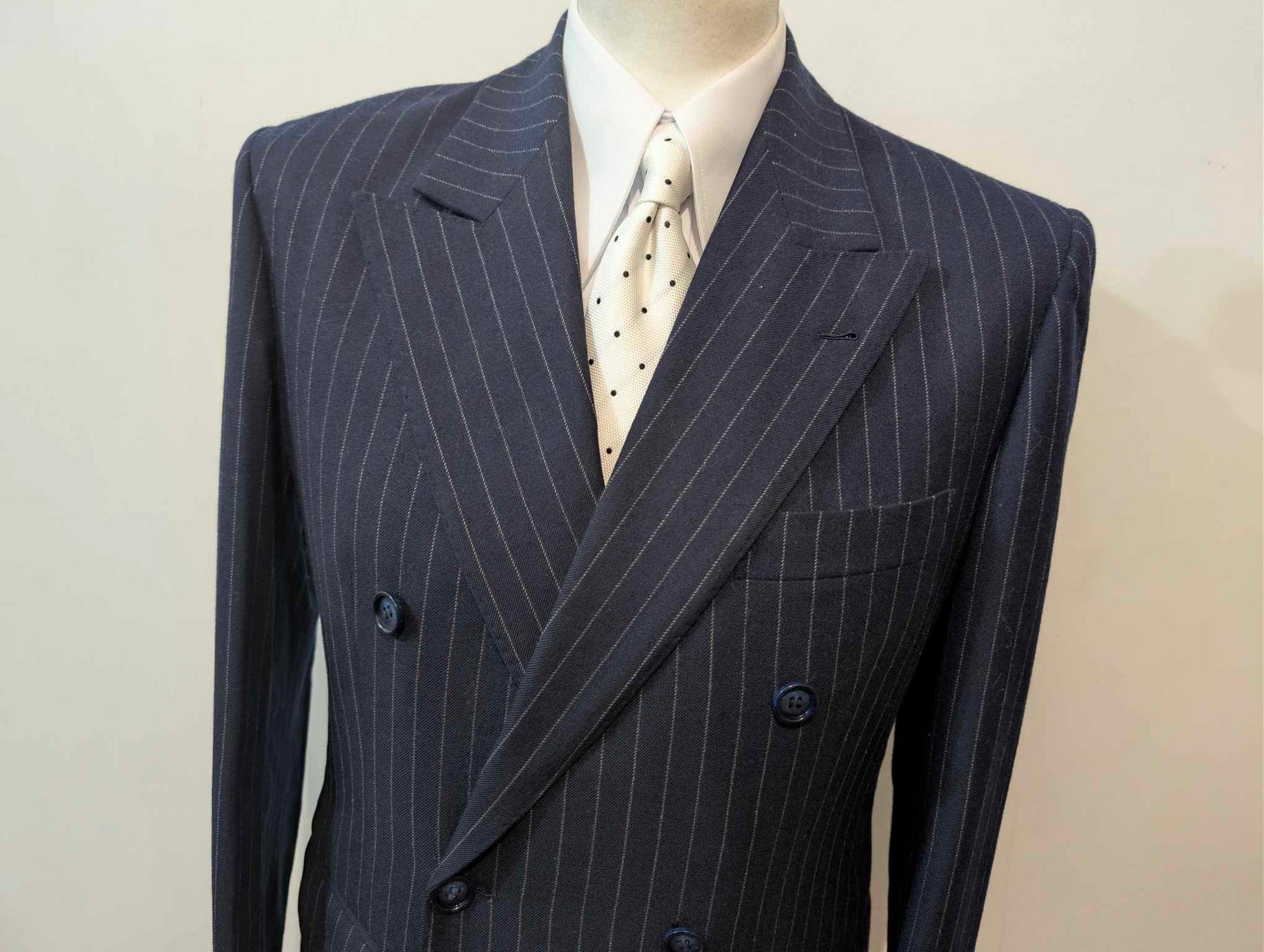 Ich biete Ihnen diesen legendären dreiteiligen, zweireihigen Nadelstreifenanzug in Marineblau mit weißen Streifen aus schwerem Flanell an.