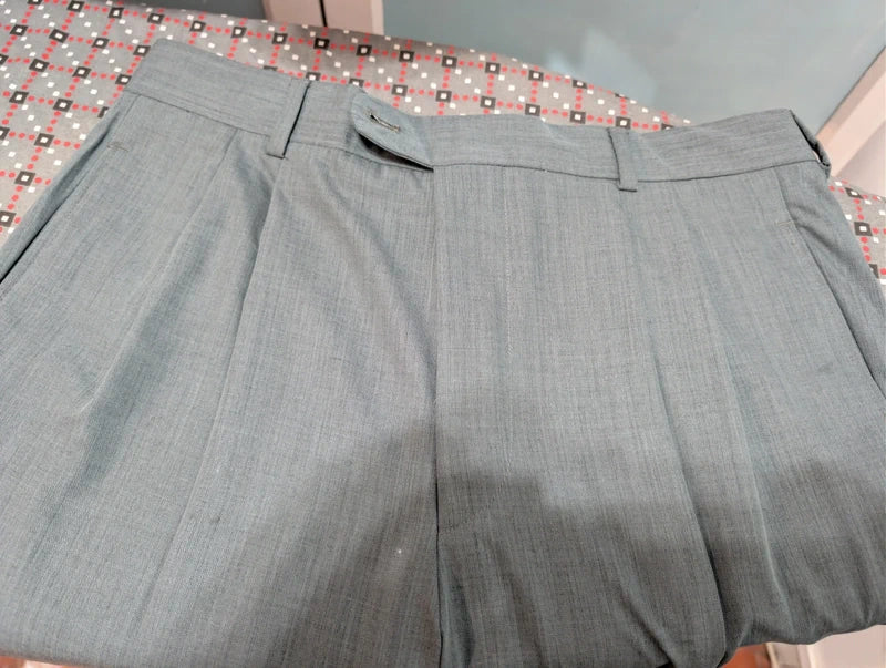 Ich biete Ihnen diesen legendären, zweireihigen Anzug in Grün aus kühler Wolle an.