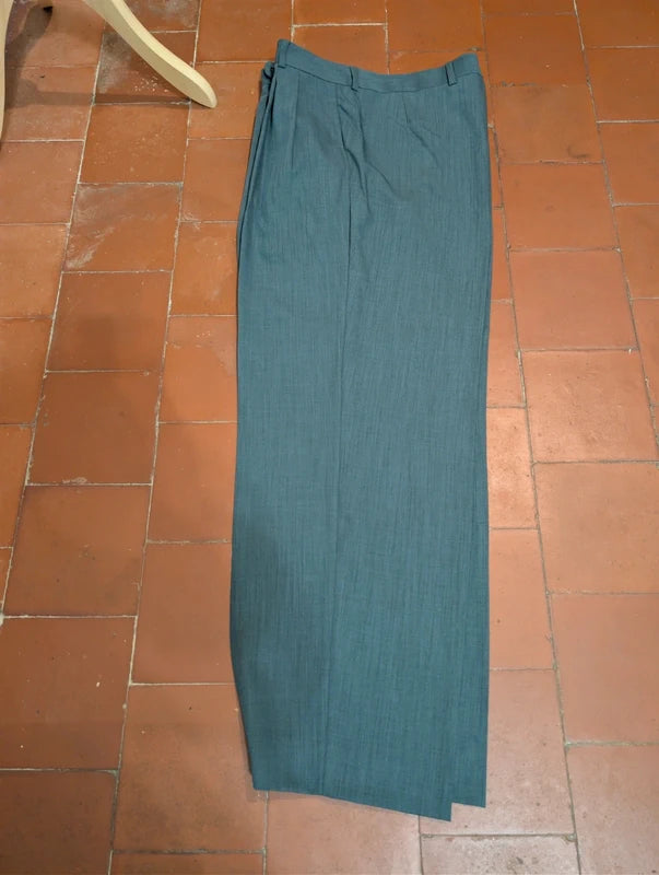 Die Hose hingegen ist weit geschnitten, hat doppelte Bundfalten und einen sehr hohen Bund.