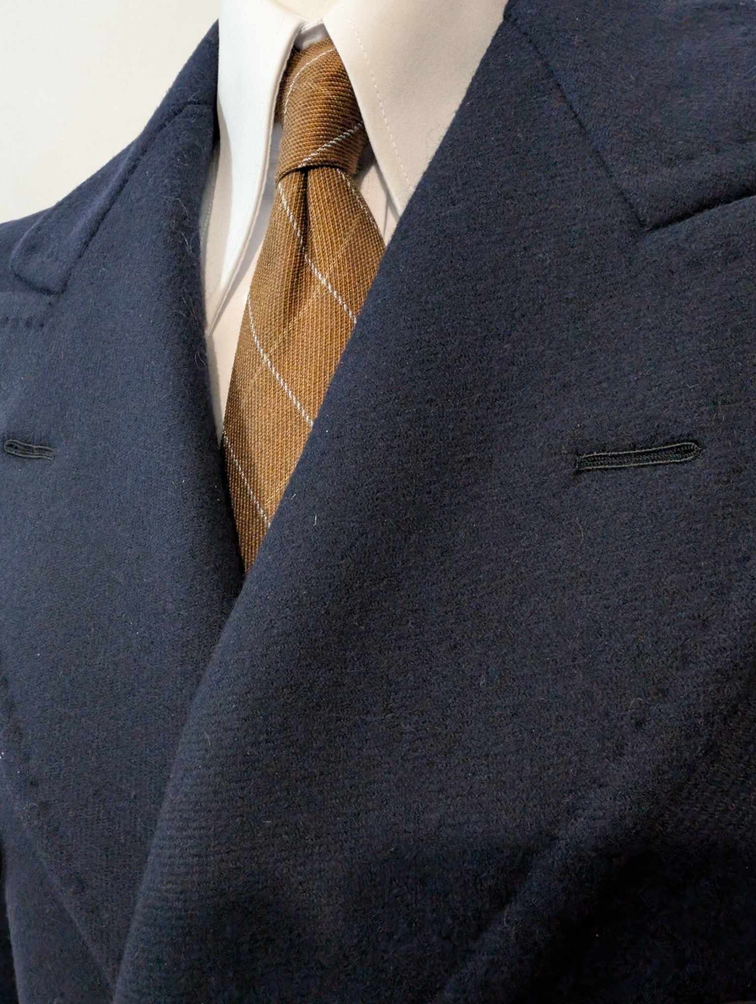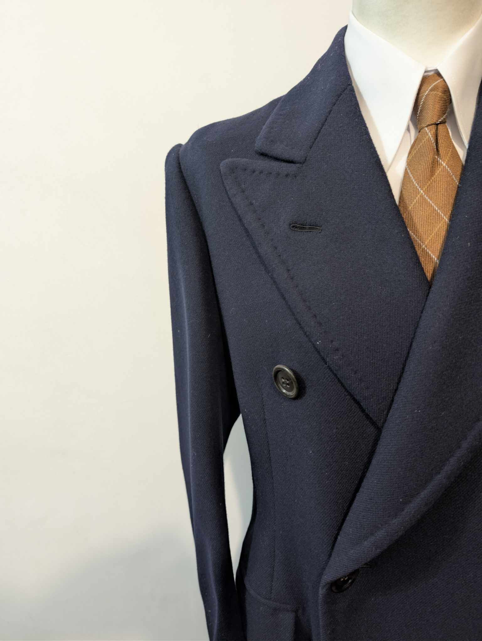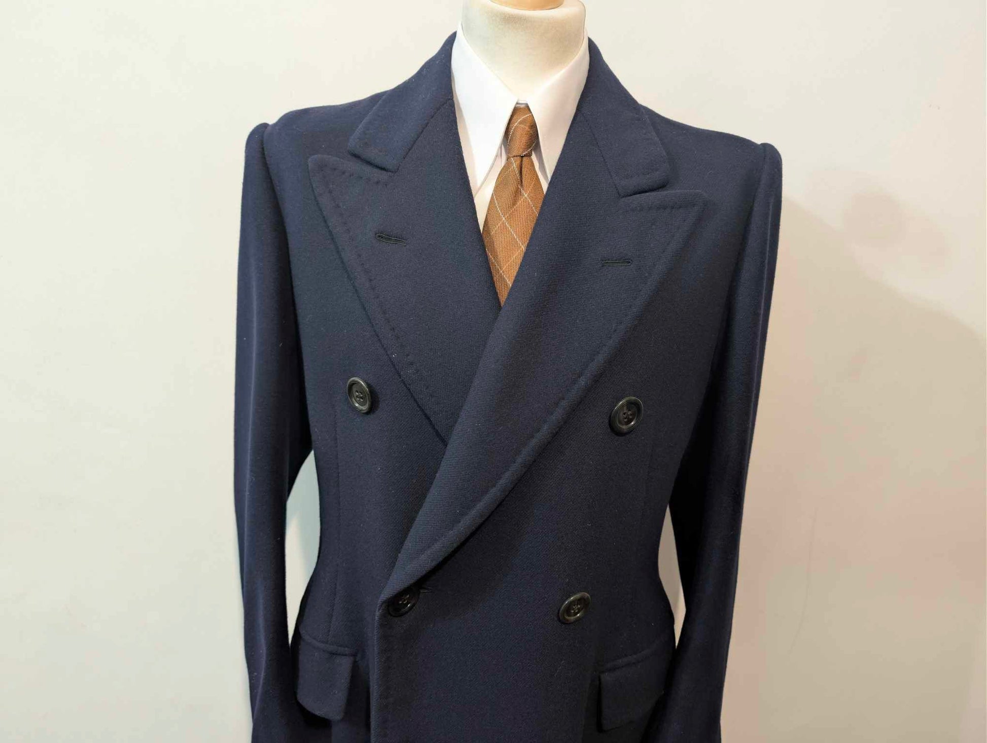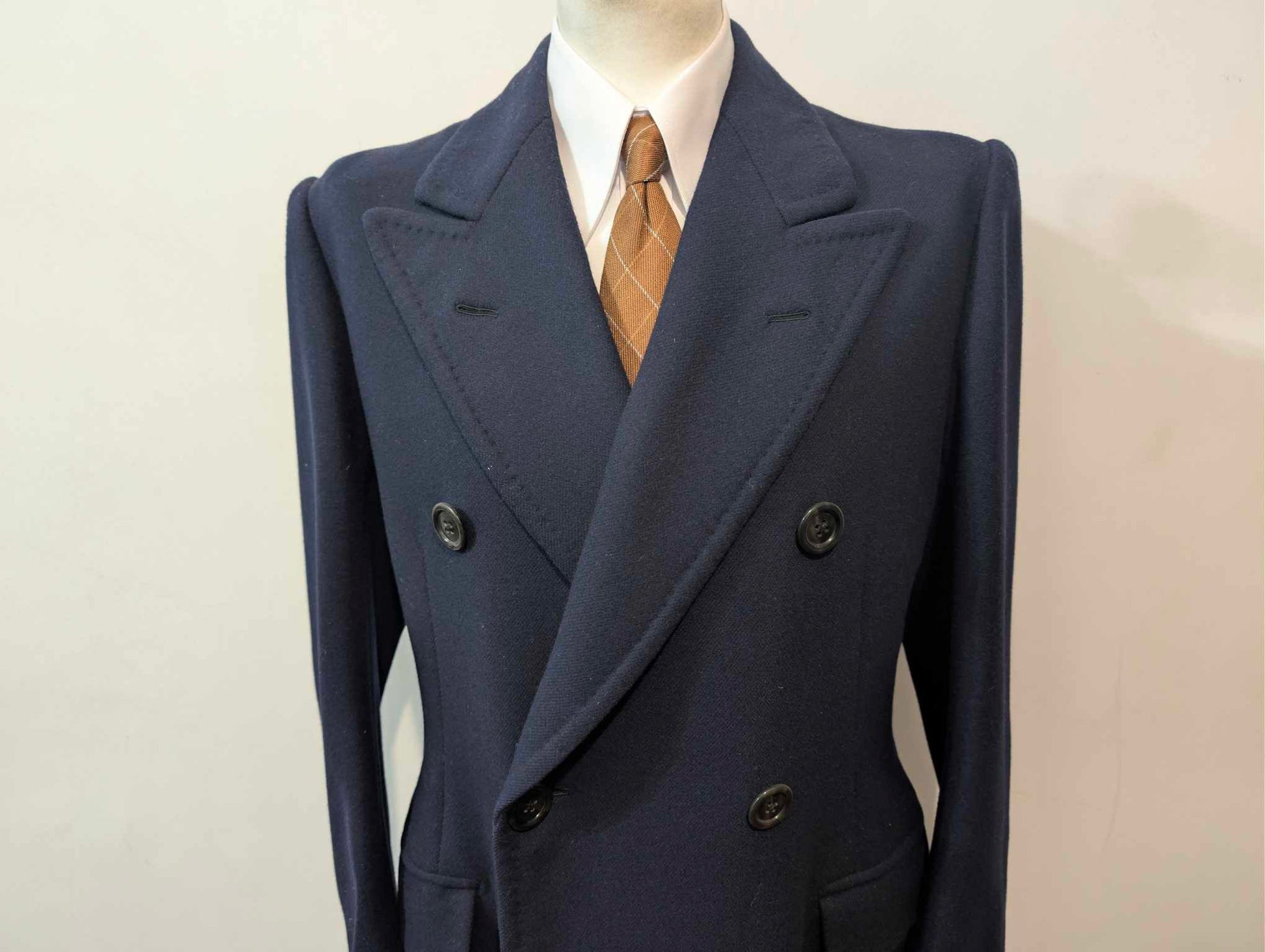 Es handelt sich um einen zweireihigen Mantel mit prächtigen, spitz zulaufenden Revers.