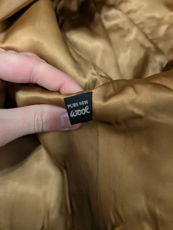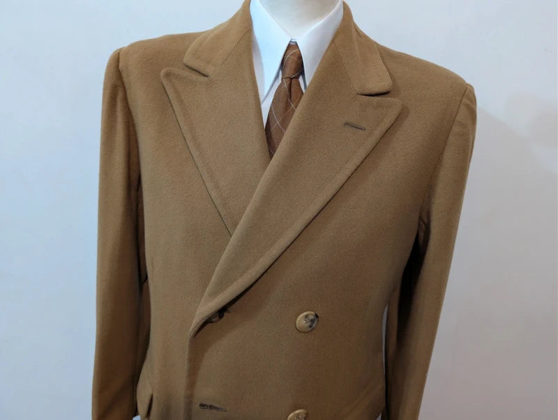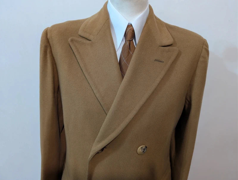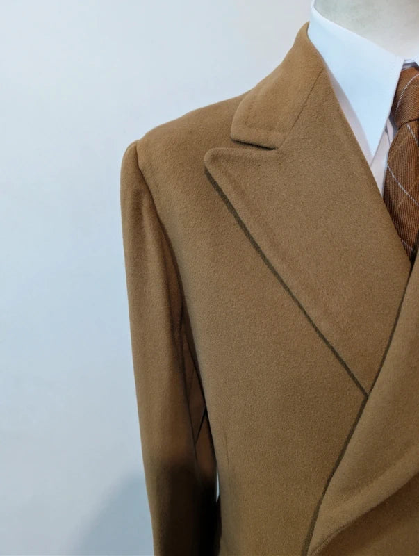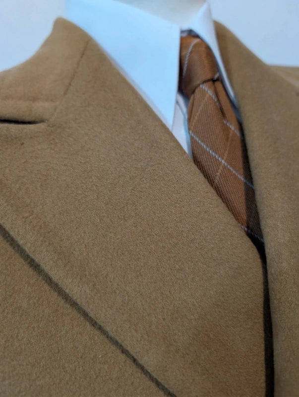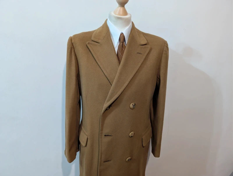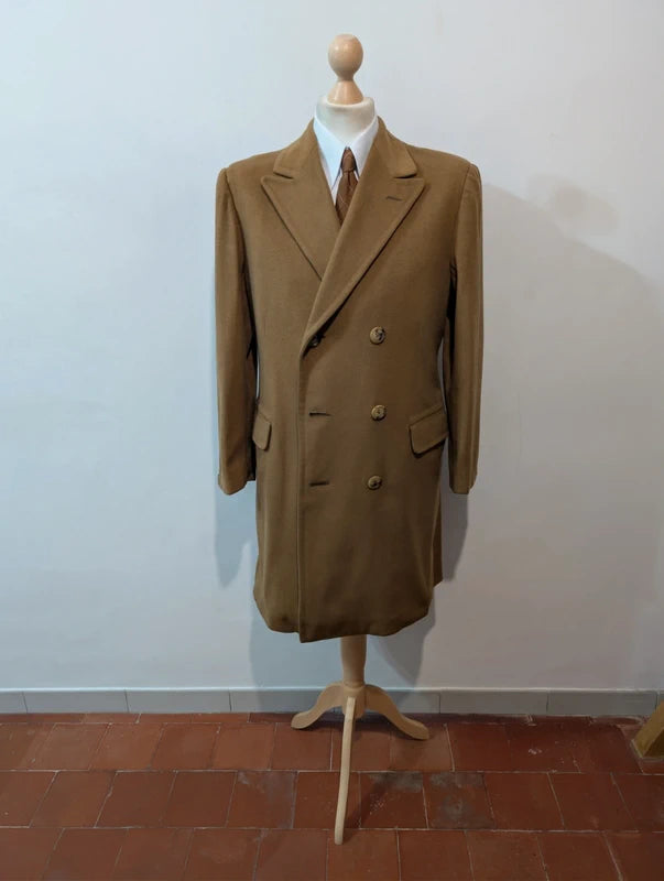 Ich biete Ihnen diesen leuchtend kamelfarbenen, zweireihigen Wollmantel an.