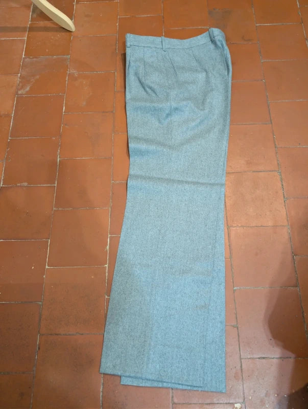 Die Hose selbst ist eine weite Hose mit doppelten Bundfalten und einem hohen, natürlichen Bund.