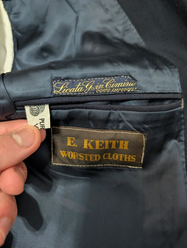 Ich biete Ihnen diesen prächtigen zweireihigen Anzug aus marineblauer Wolle an.