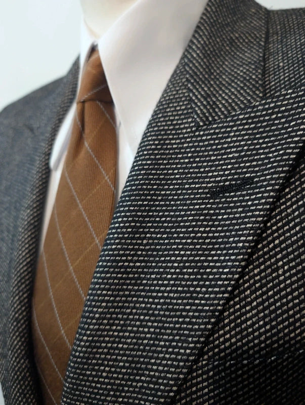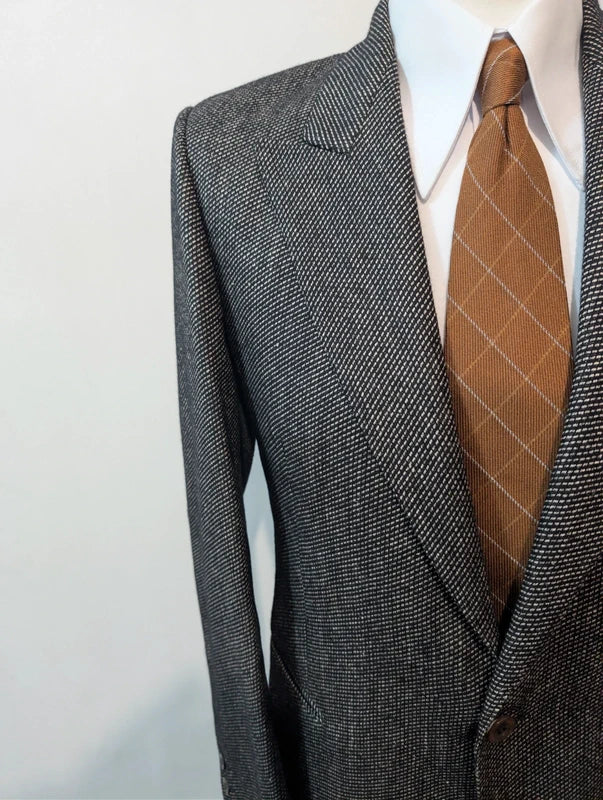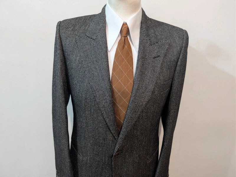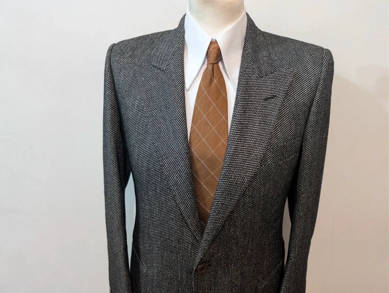 Es handelt sich um eine Jacke, ein einreihiges Modell mit prächtigen, spitz zulaufenden Revers.