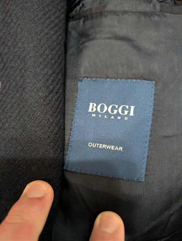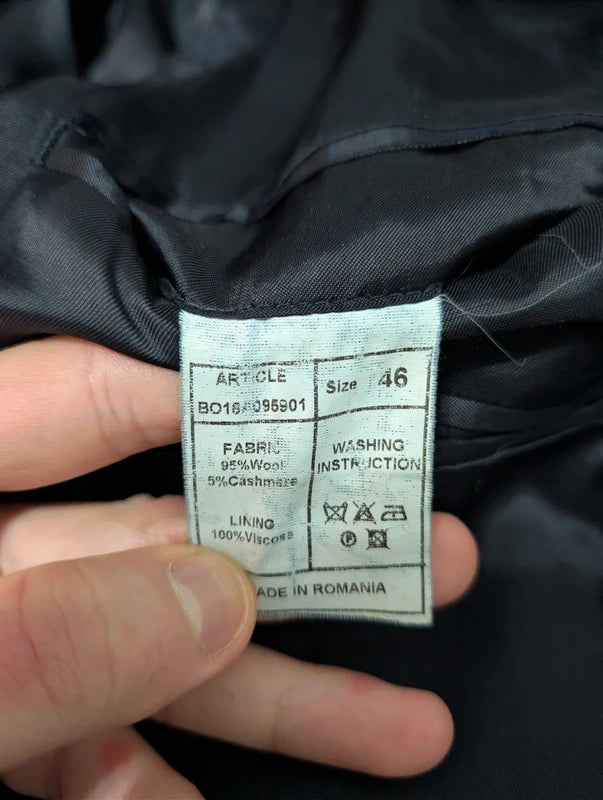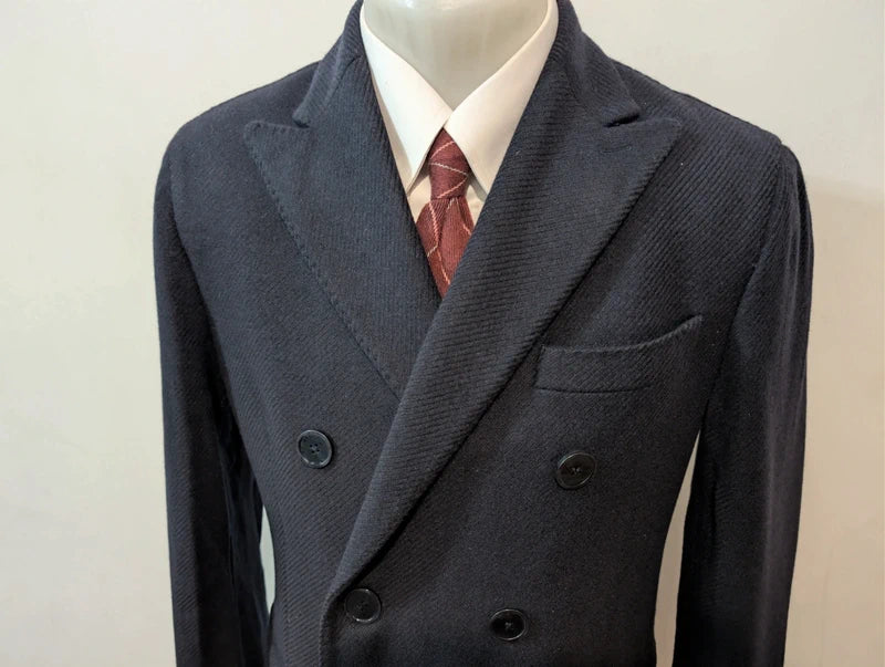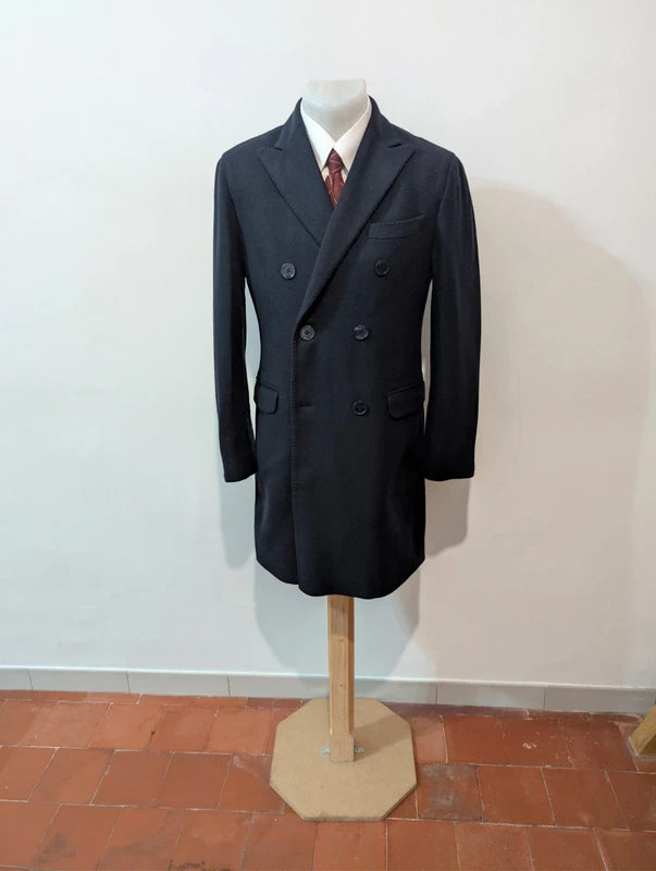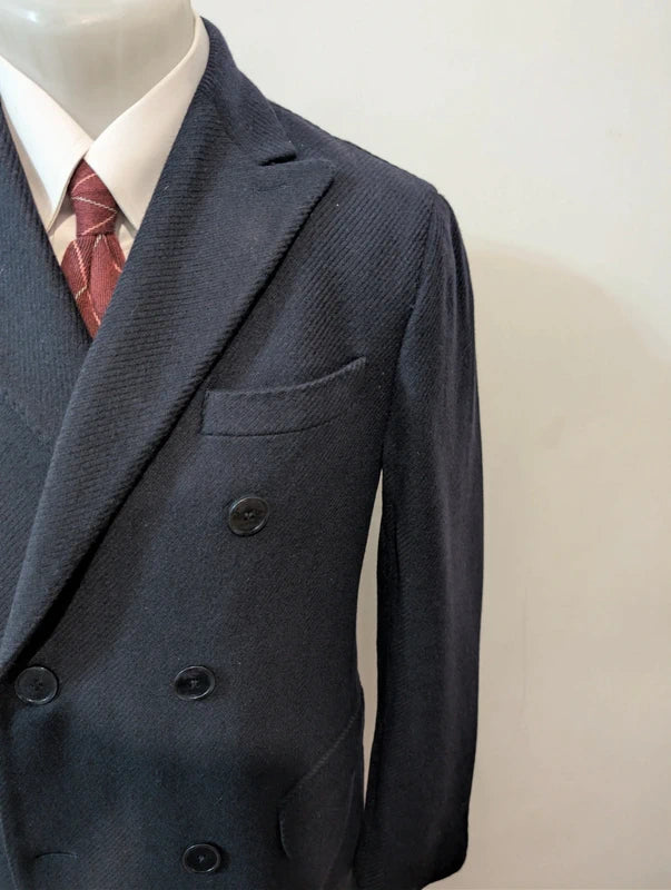 Ich biete Ihnen diesen kleinen, zweireihigen Mantel in Blau und Marineblau an, gefertigt aus Wolle und Kaschmir.