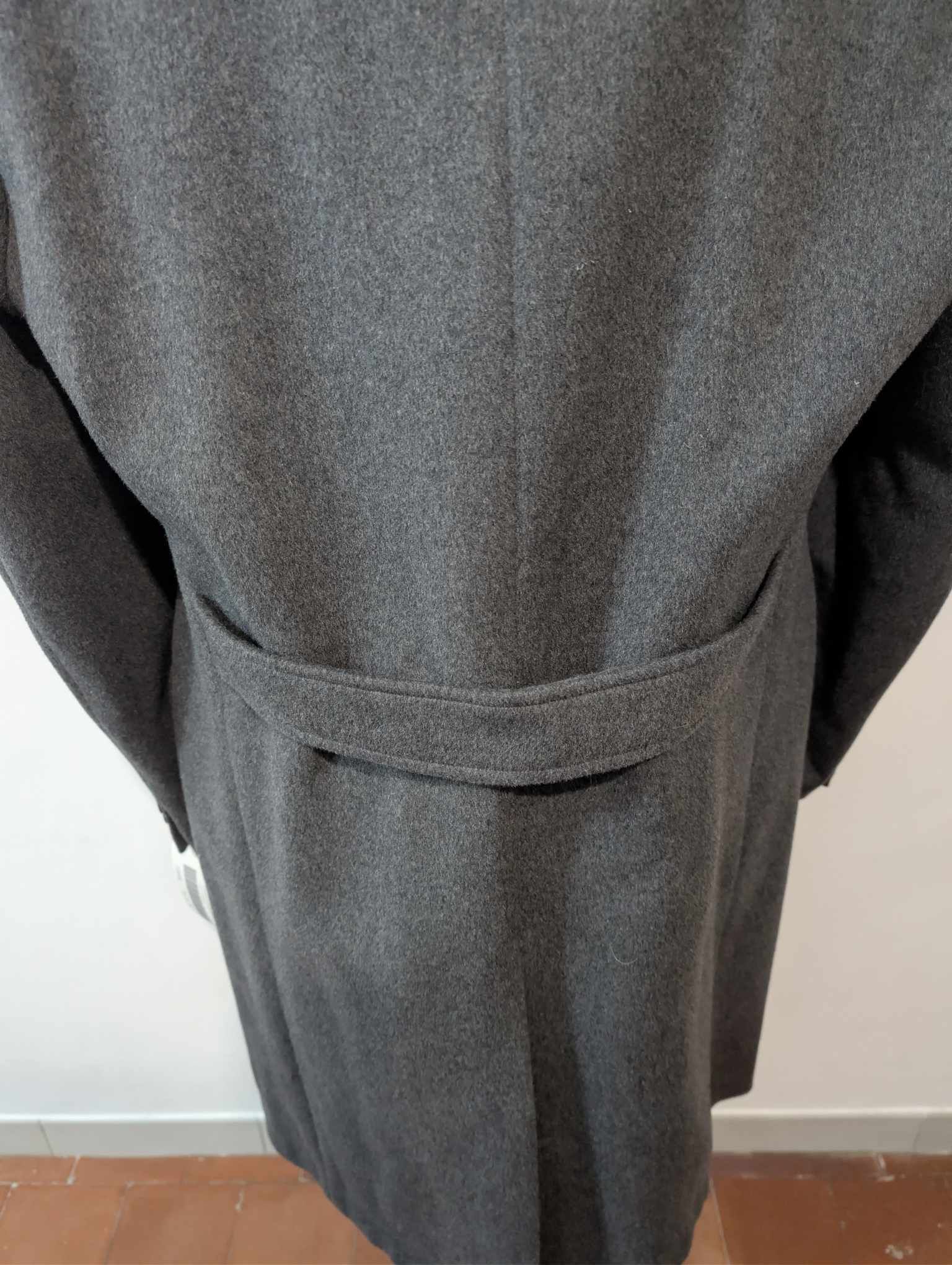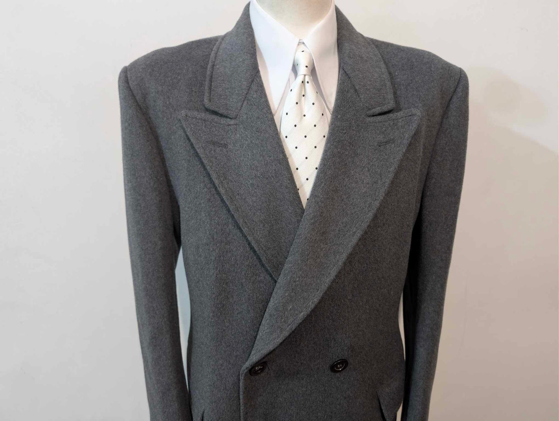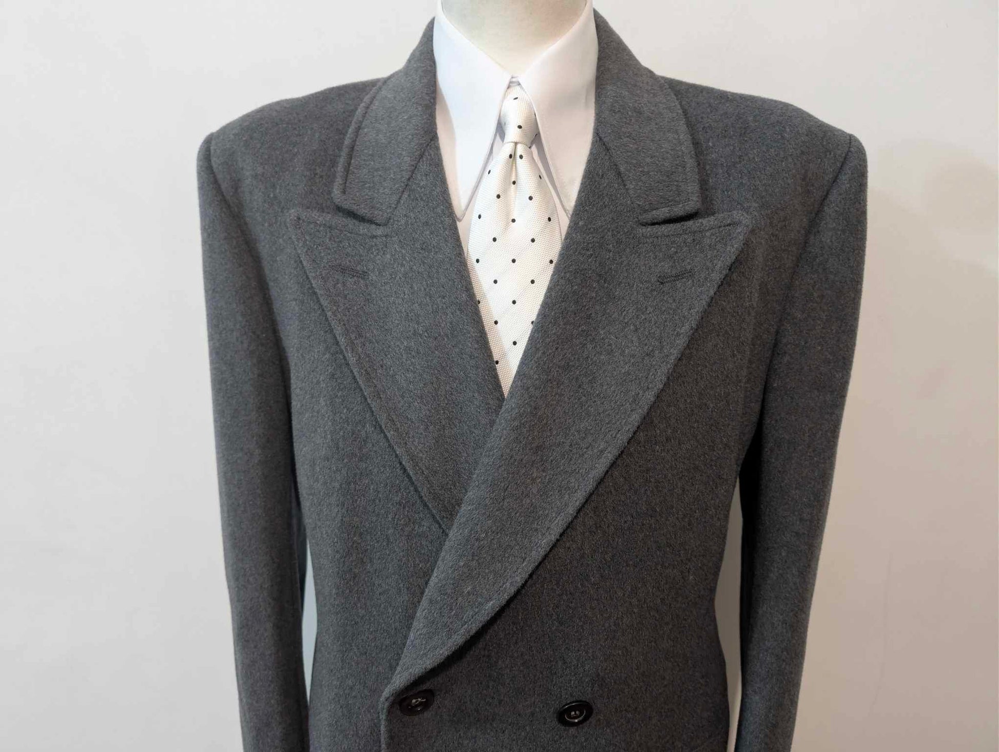 Ich biete Ihnen diesen erlesenen, zweireihigen grauen Wollmantel an.