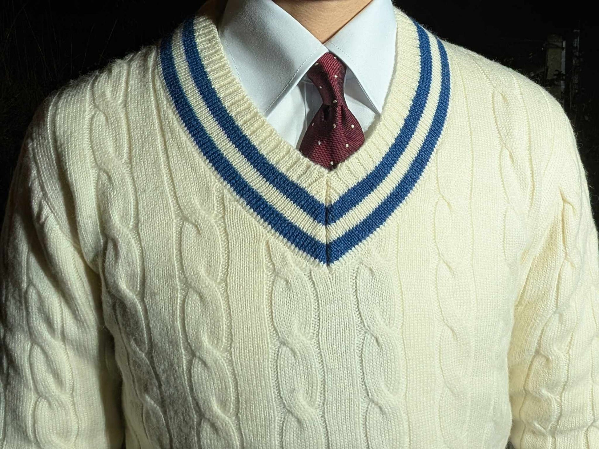 Description: Cream-colored cricket sweater with navy blue stripes, made of 100% merino wool.
