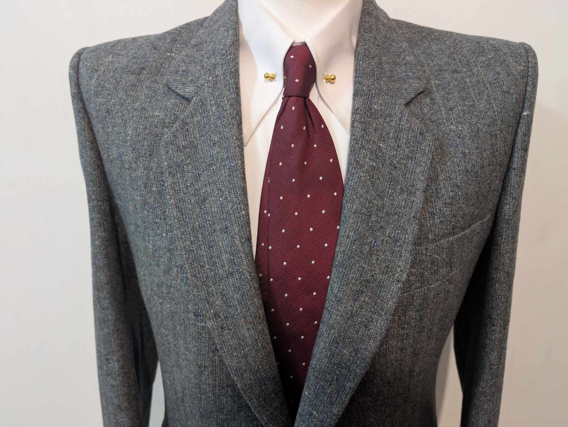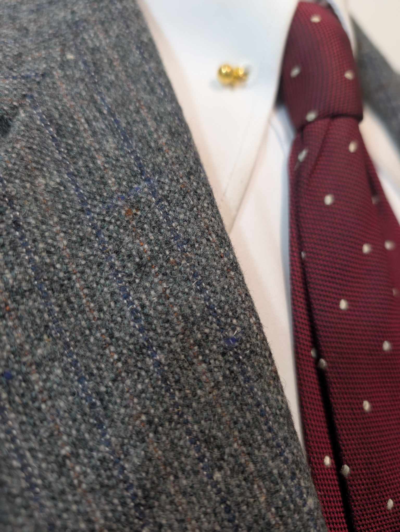Je vous propose cet adorable costume de couleur gris à rayures, discrète en donegal tweed.