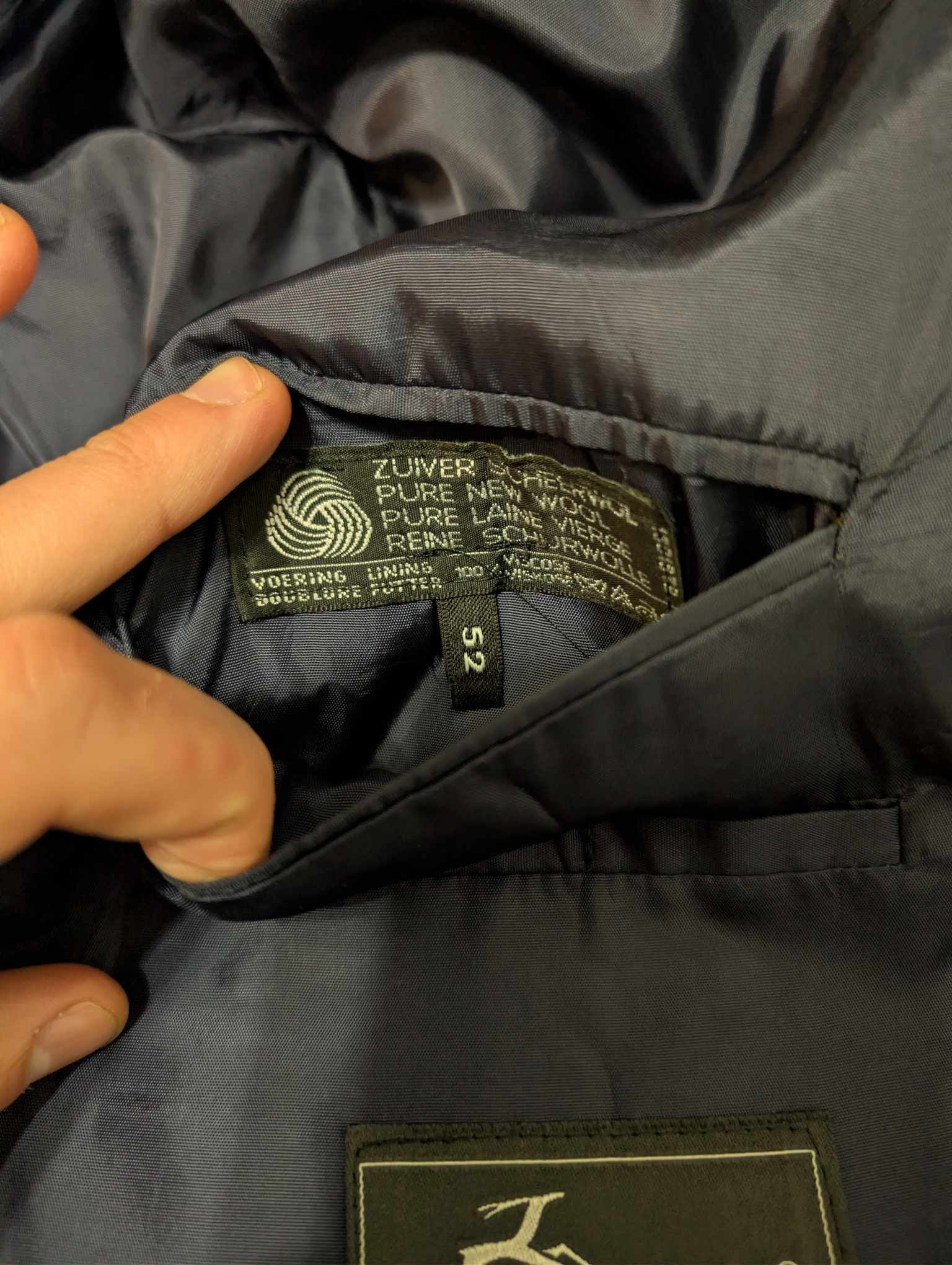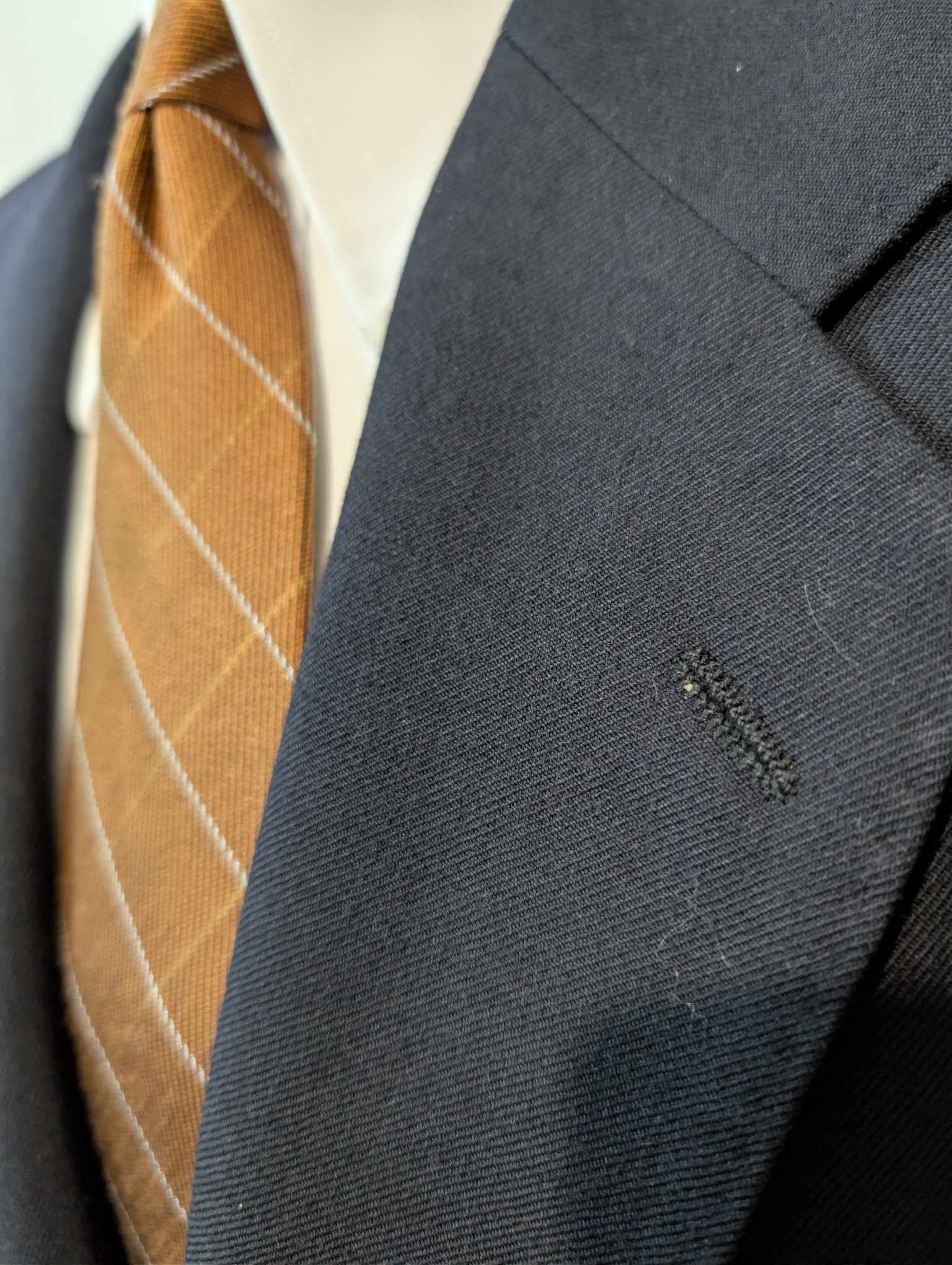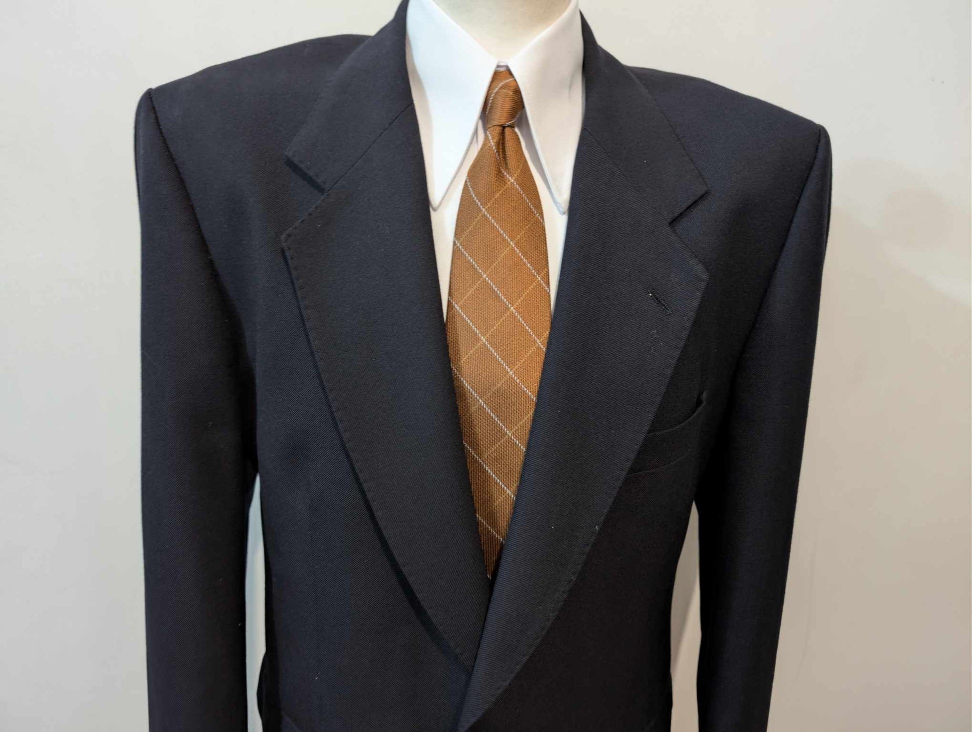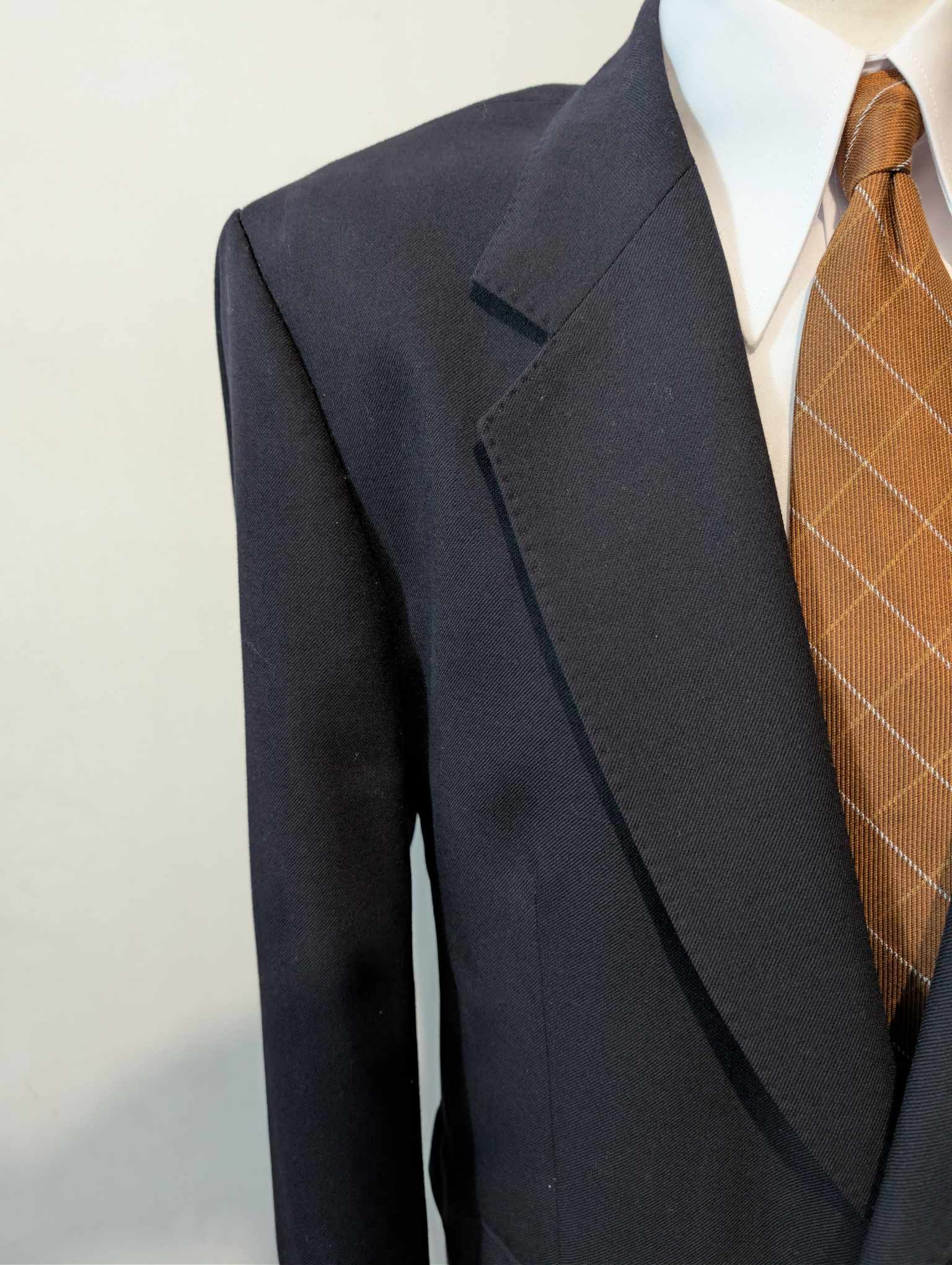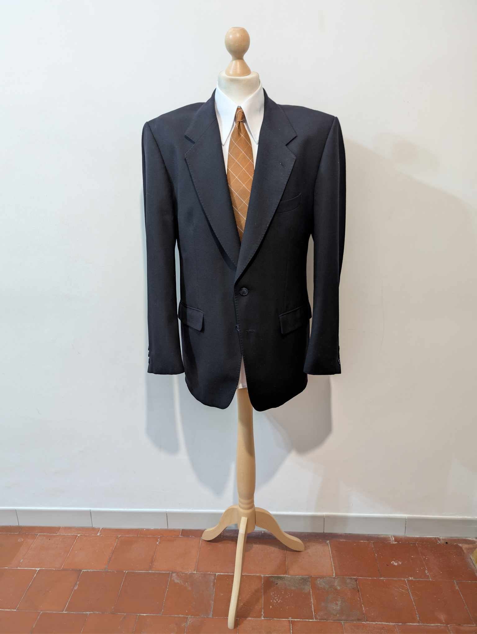 Je vous propose ce classique costume de couleur bleu marine en laine.