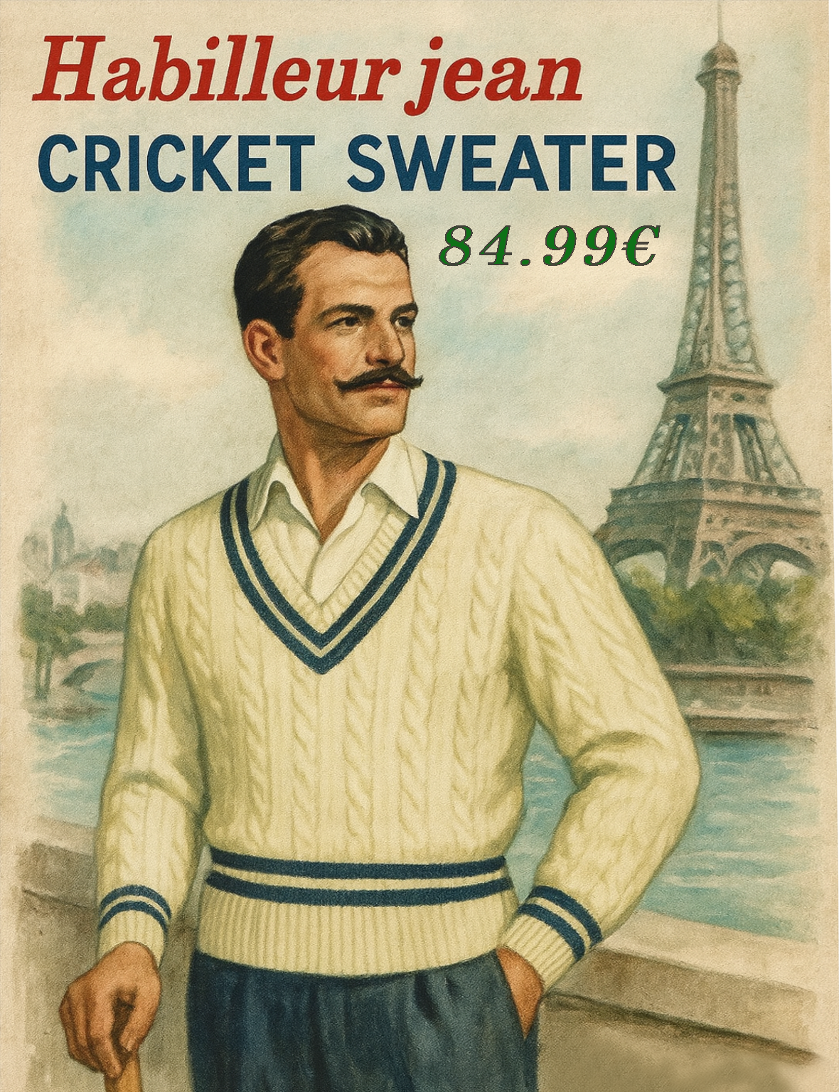 Pull cricket de couleur crème à rayure bleu marine en 100% laine merinos.