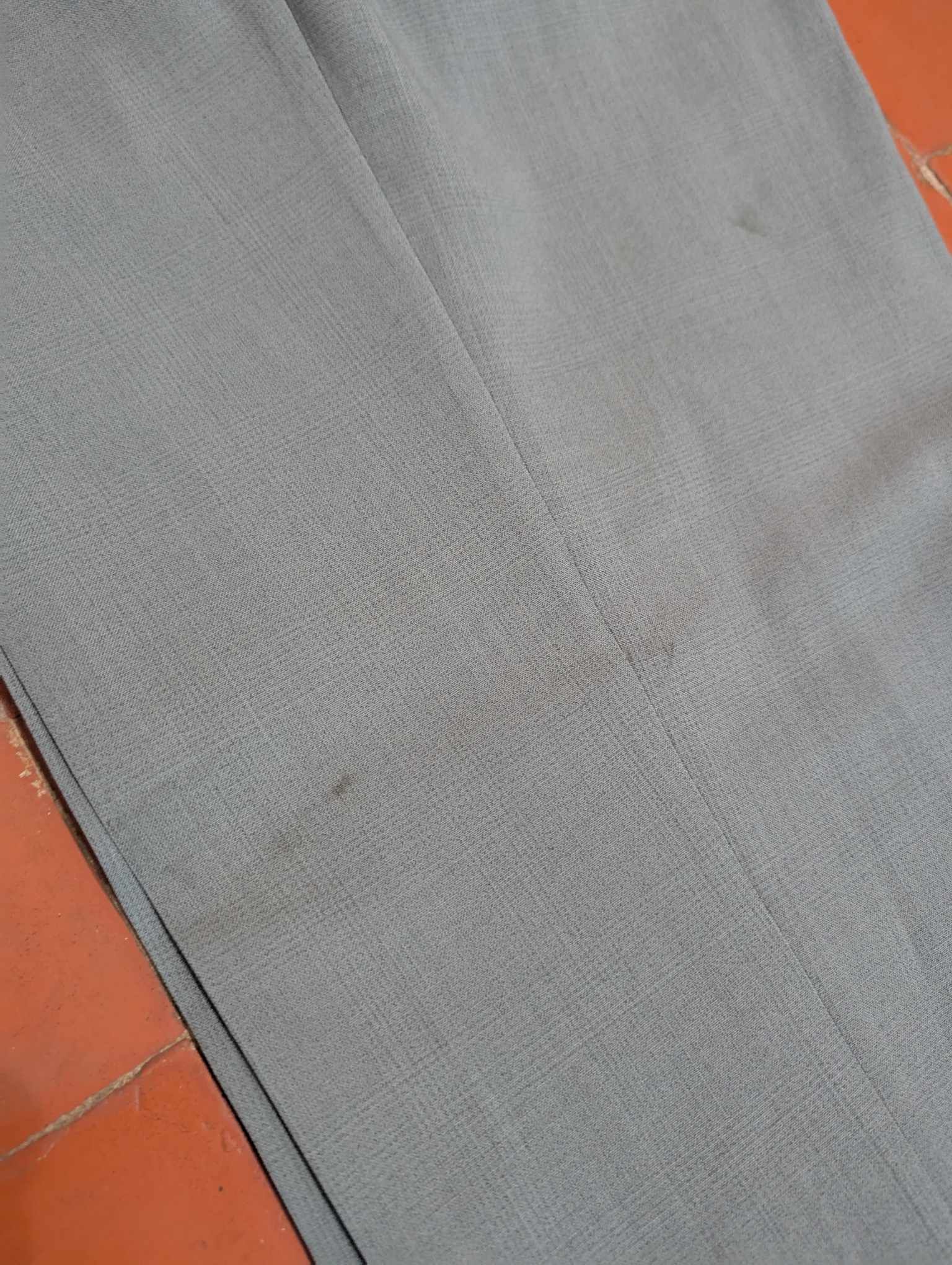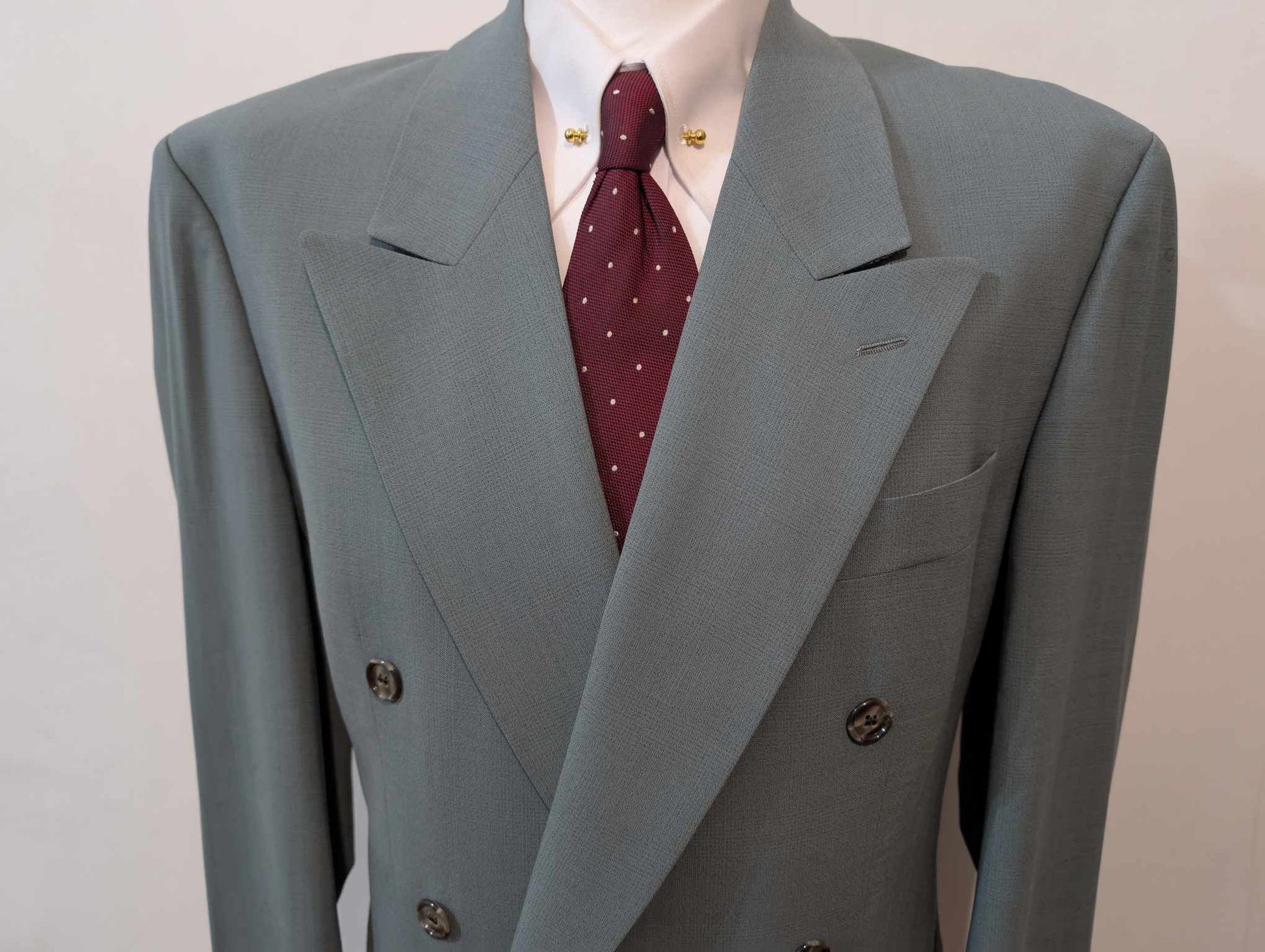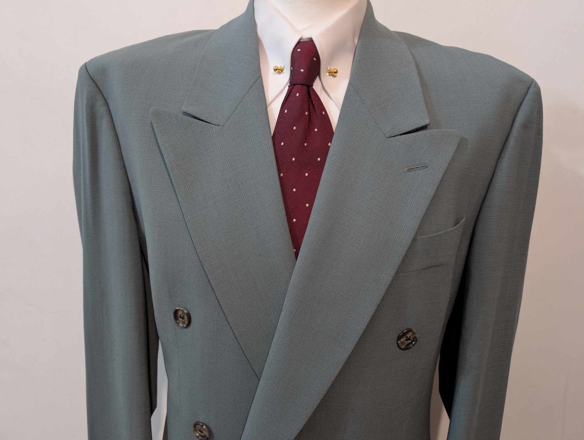 Je vous propose cet élégant costume croisé de couleurs gris bleu à motif prince de Galles discret en laine.