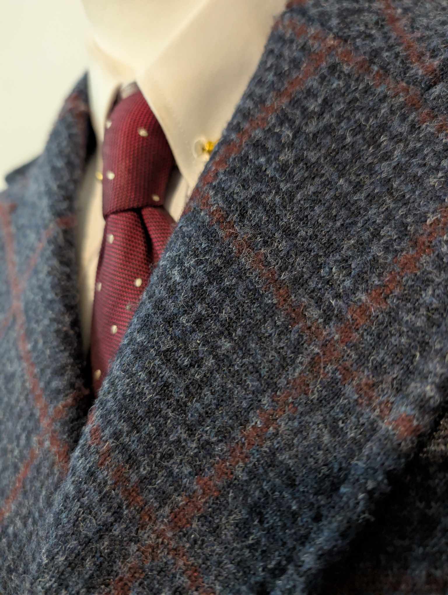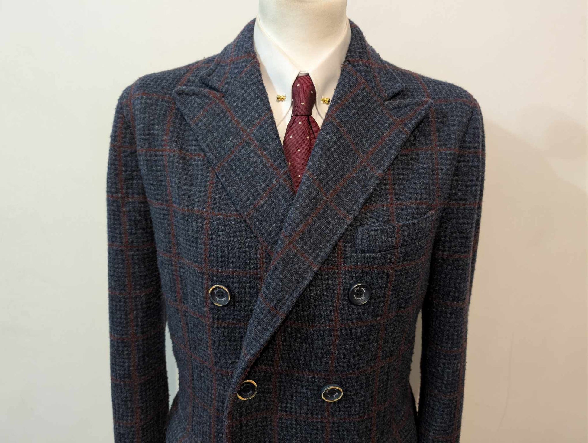 Je vous propose cet élégant manteau croisé de couleur gris bleu à carreaux rouge en tweed.