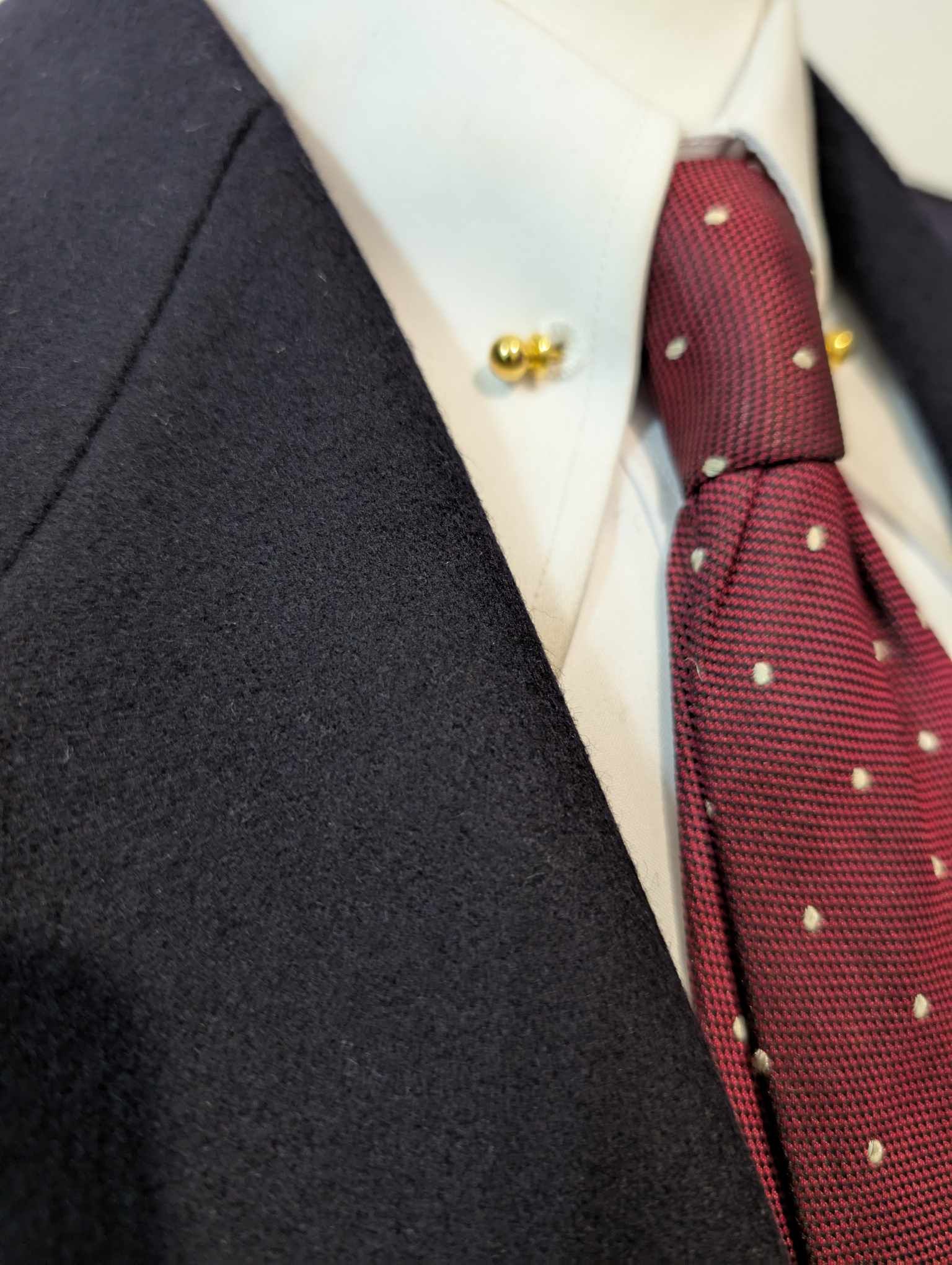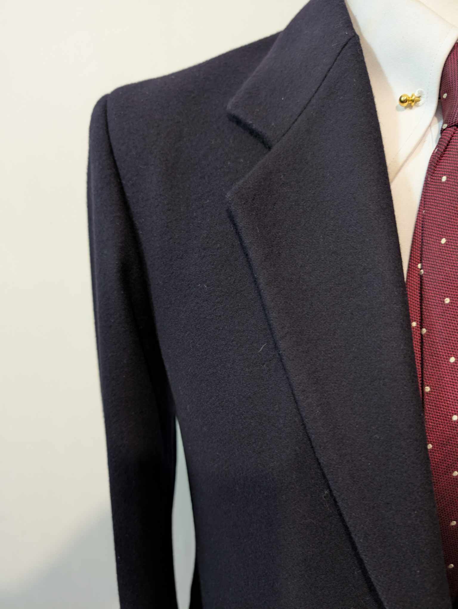 je vous présente cette élégante veste de couleur bleu marine en flanelle de laine et cachemire.