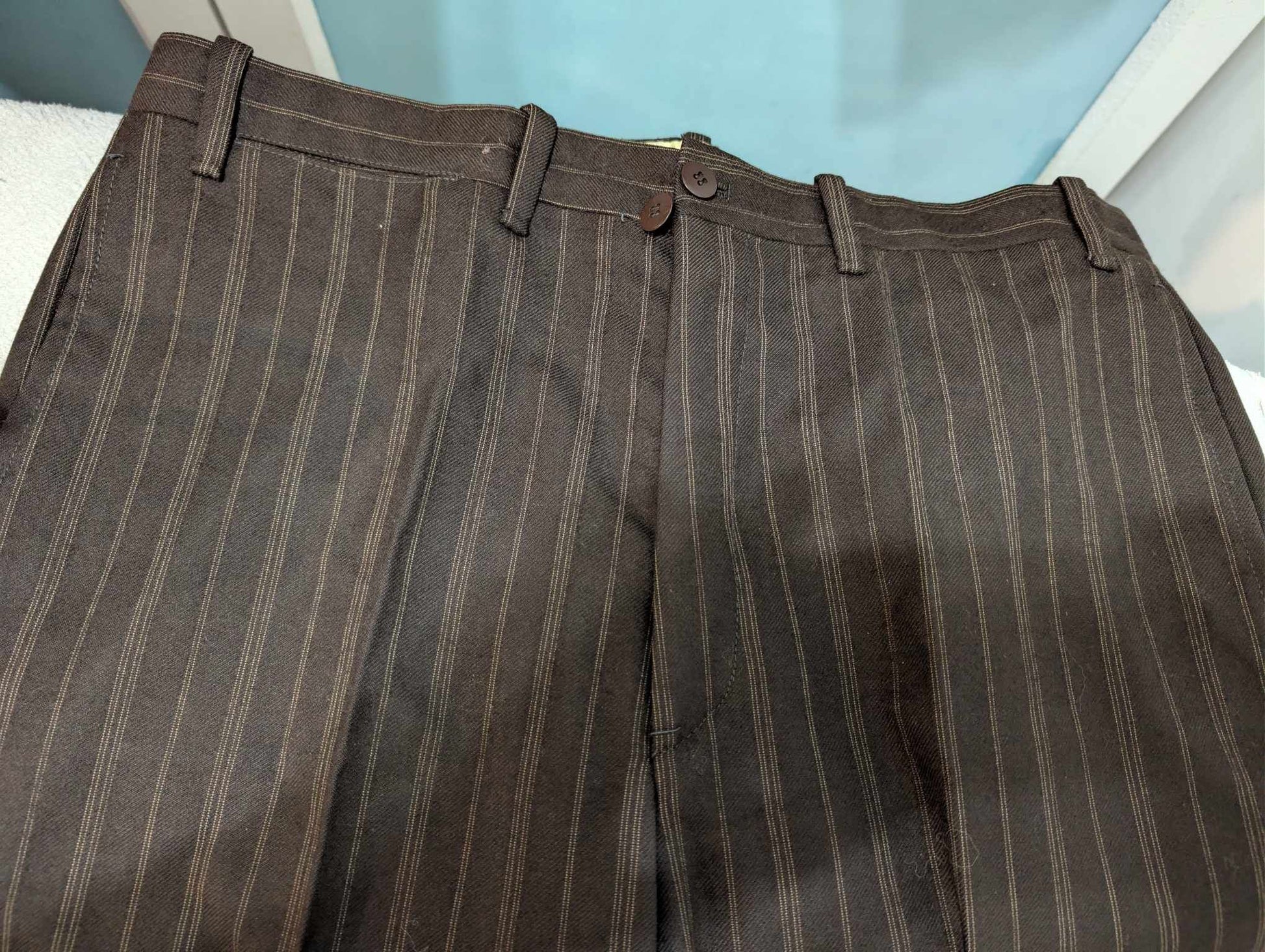 Je vous propose ce fabuleux costume 3 pièces pinstripe de couleur marron en flanelle de laine.