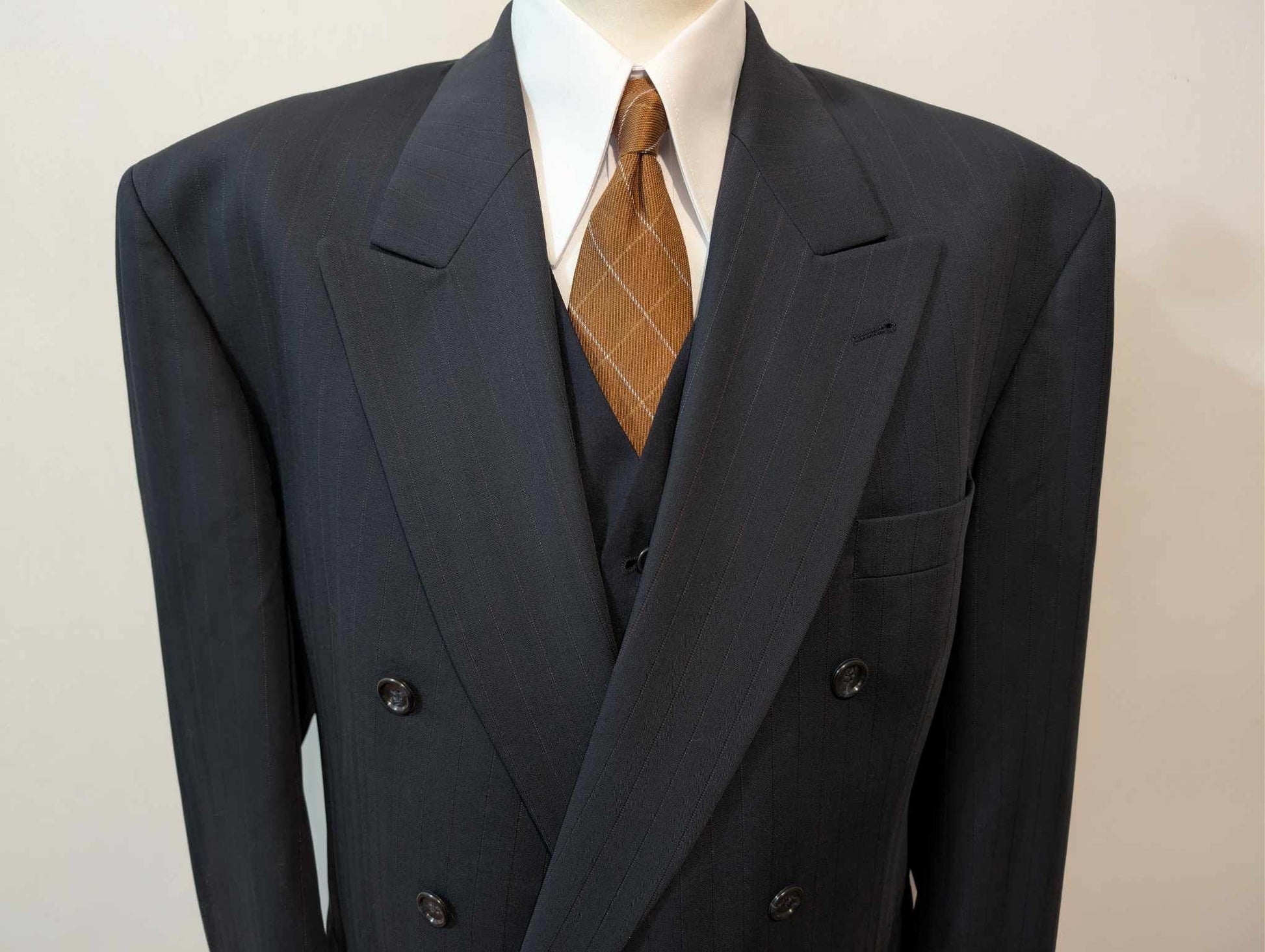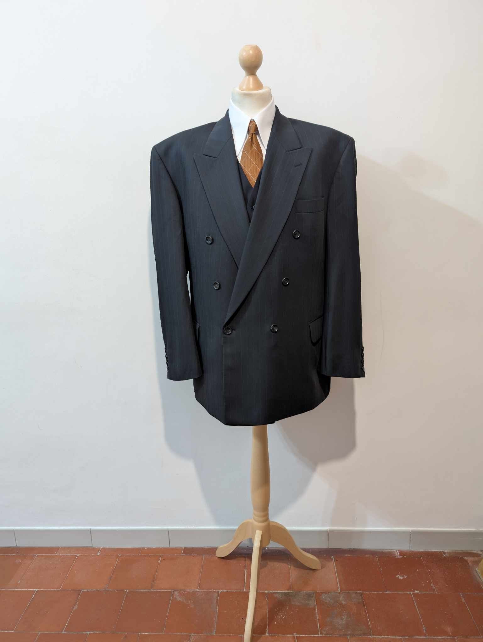 Je vous propose ce géant costume croisé pinstripe de couleur bleu marine à fine rayures rouge en laine.