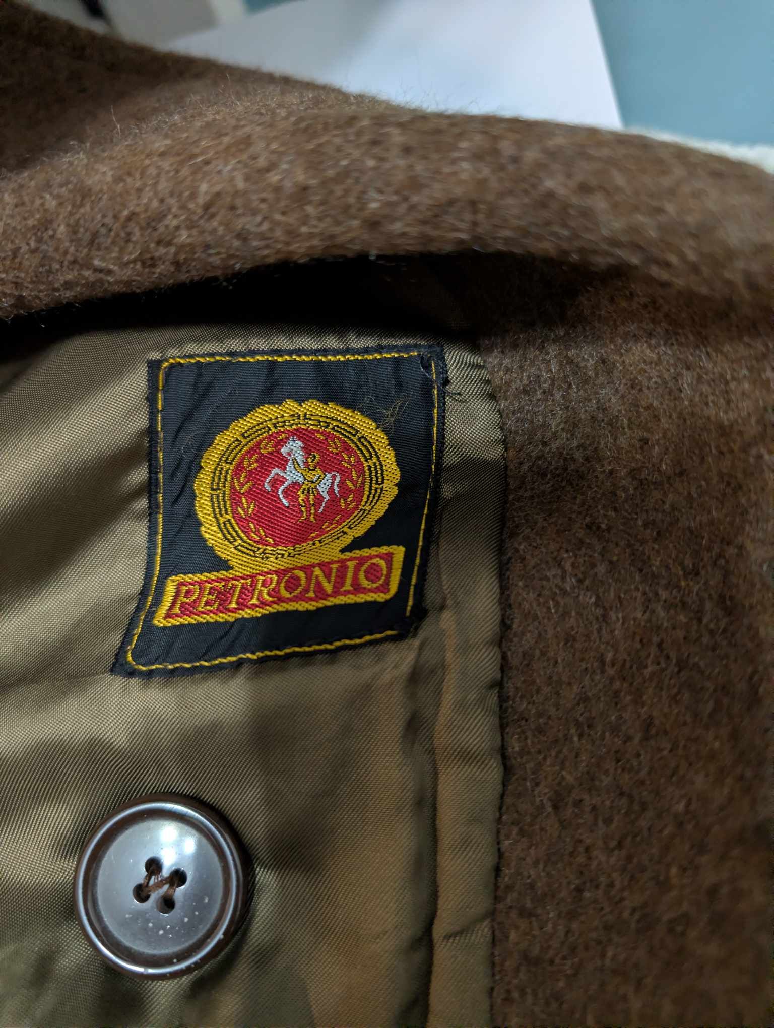 Je vous propose gentil manteau croisé de couleur marron en laine épaisse.