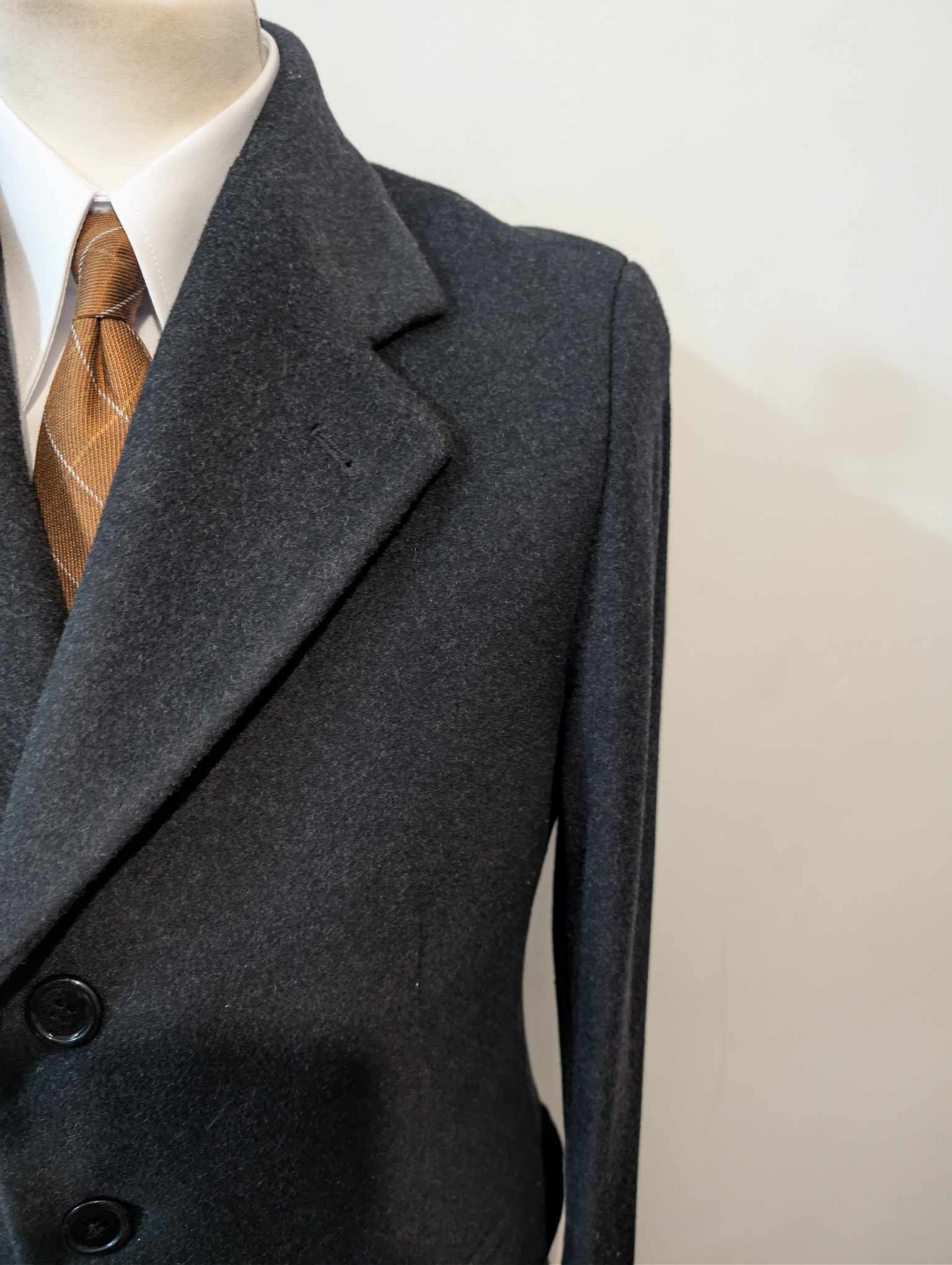 Je vous propose ce gentil manteau de couleur gris anthracite presque noir en laine et cachemire.