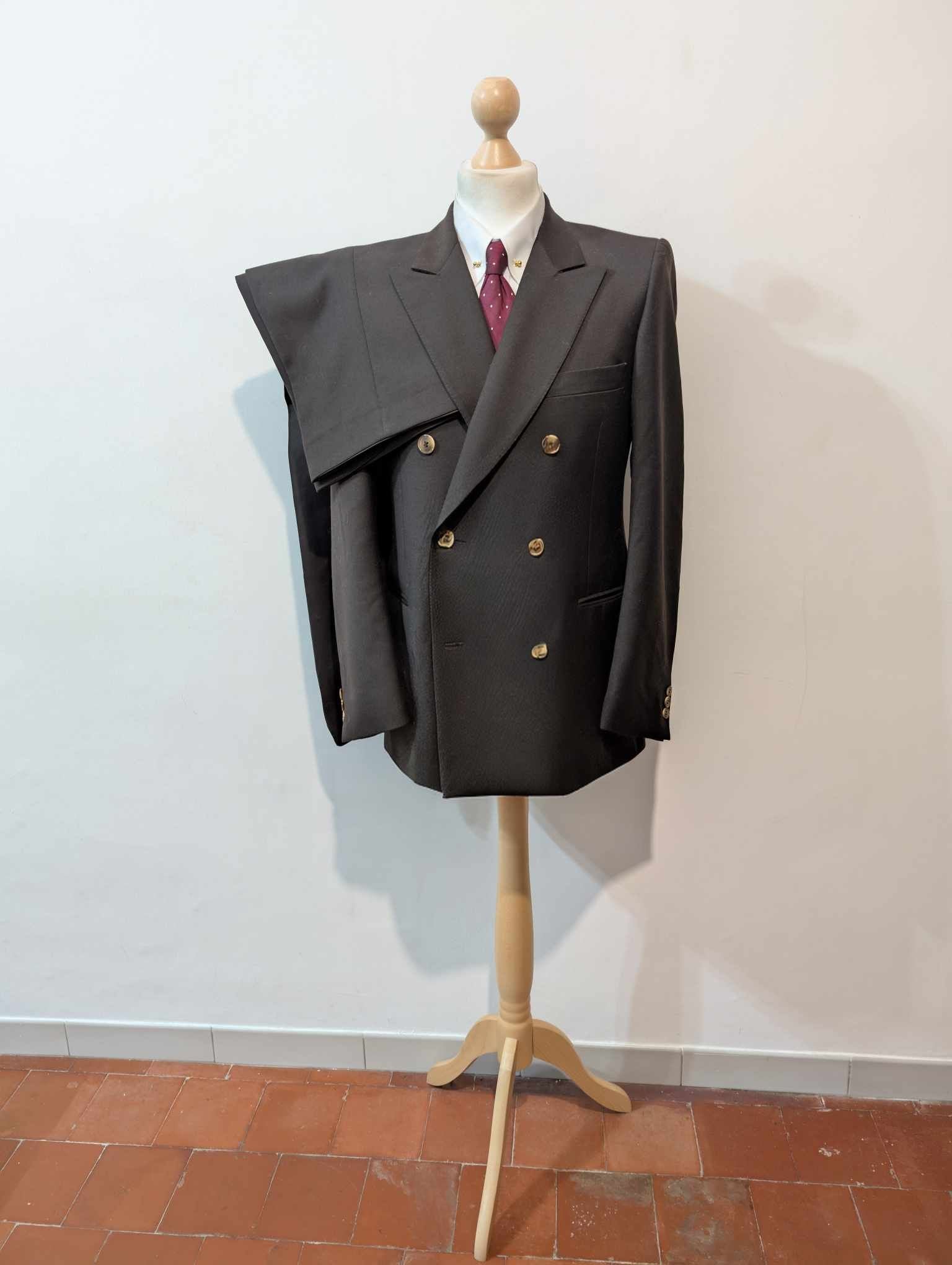 Je vous propose ce gentil costume croisé de couleurs marron en laine.
