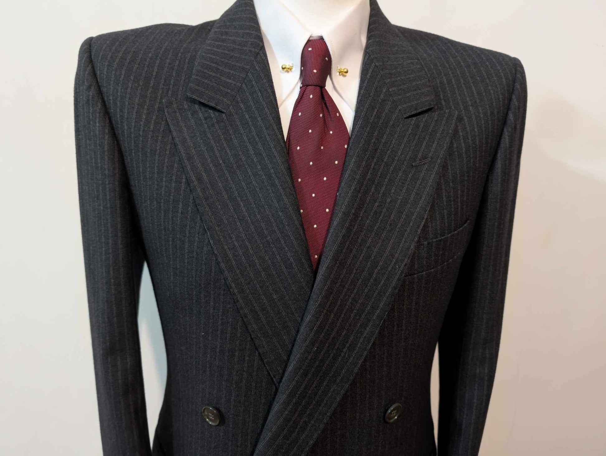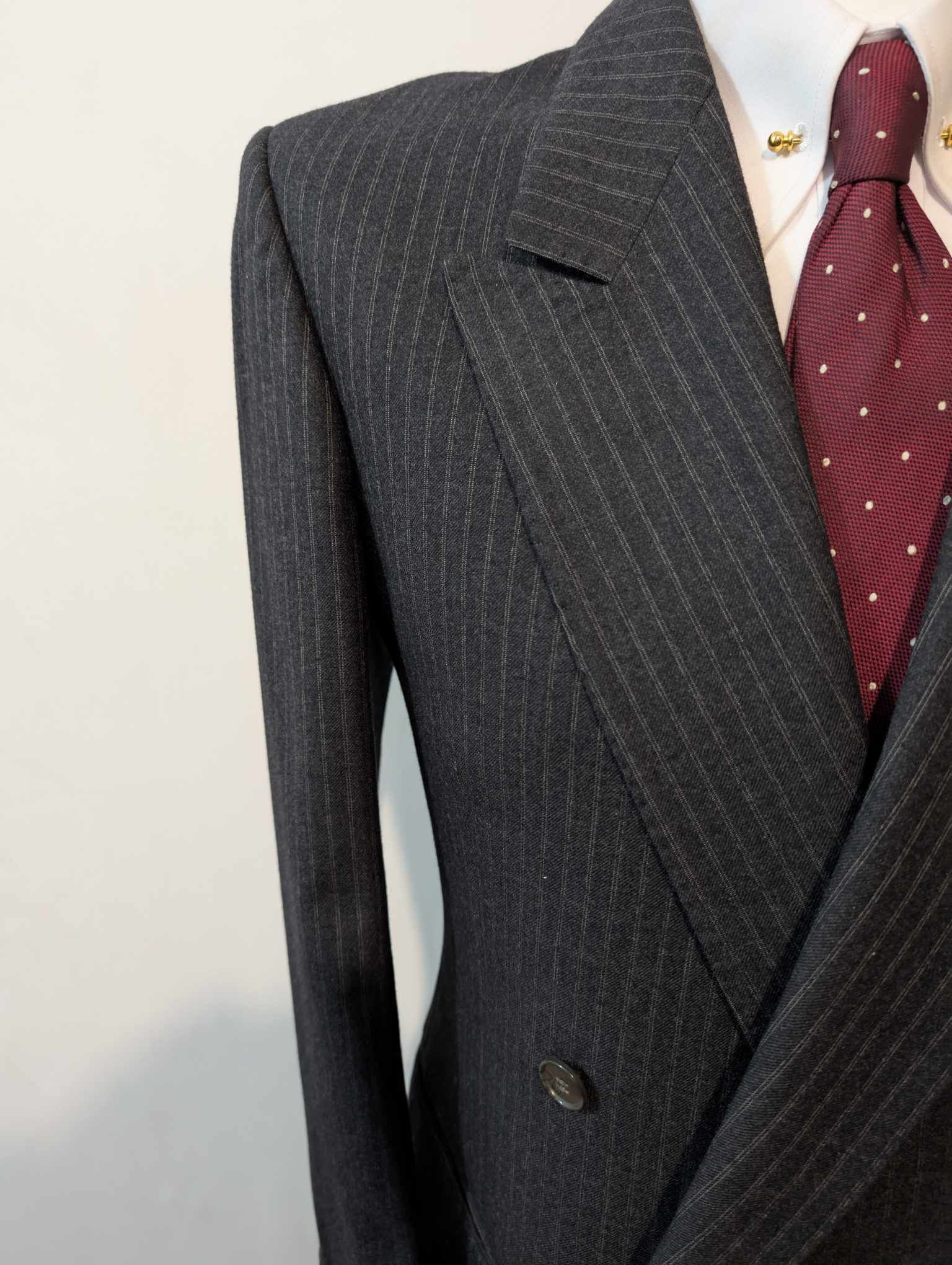 Je vous propose cet incroyable costume croisé pinstripe de couleur gris anthracite à fine rayure blanche en flanelle laine