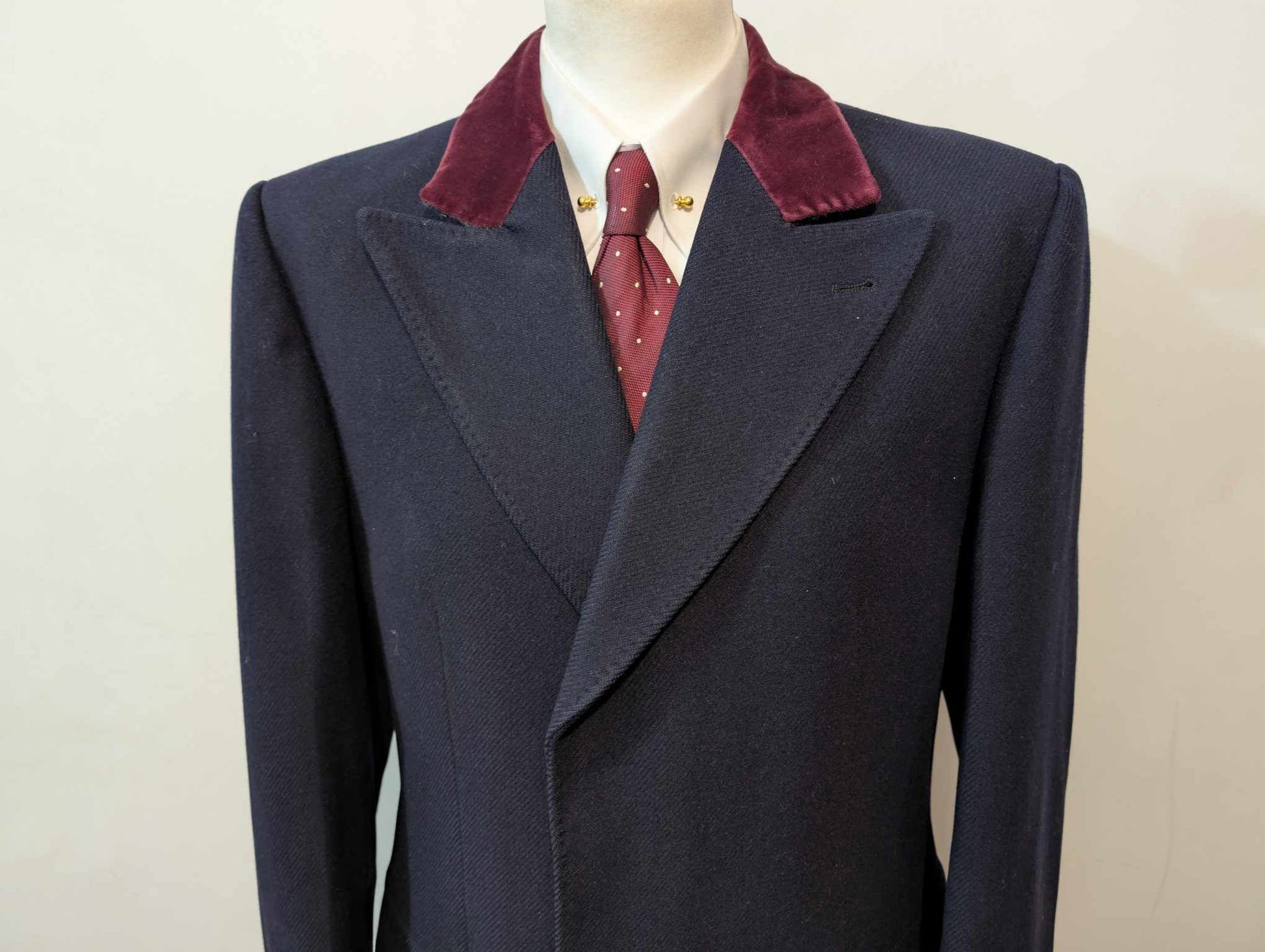 Je vous propose ce légendaire manteau Chesterfield de couleur bleu marine à colle en velours Bordeaux en laine.