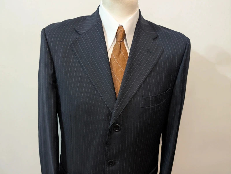 Je vous propose ce magnifique costume pin stripe de couleur bleu marine en laine.
