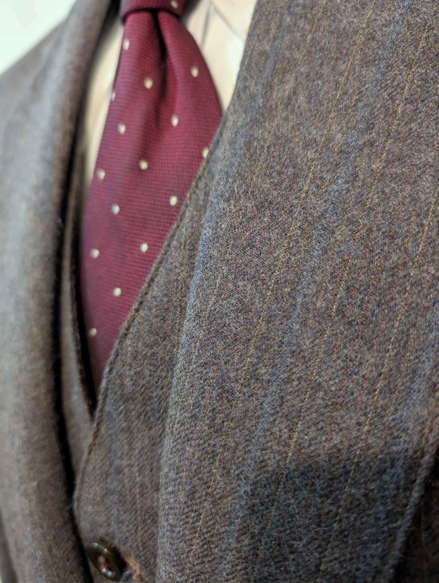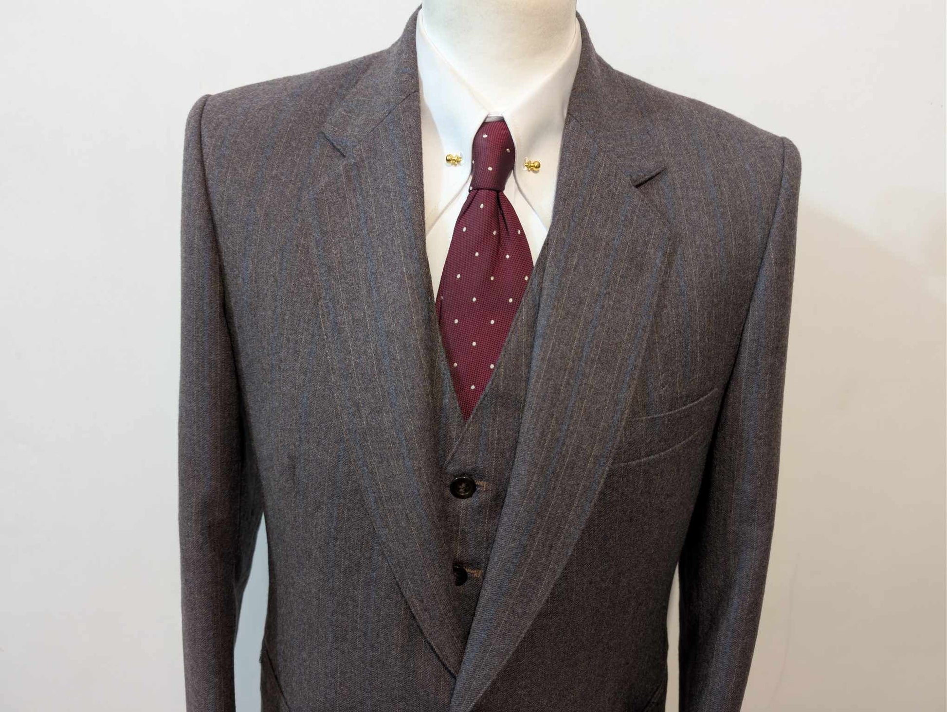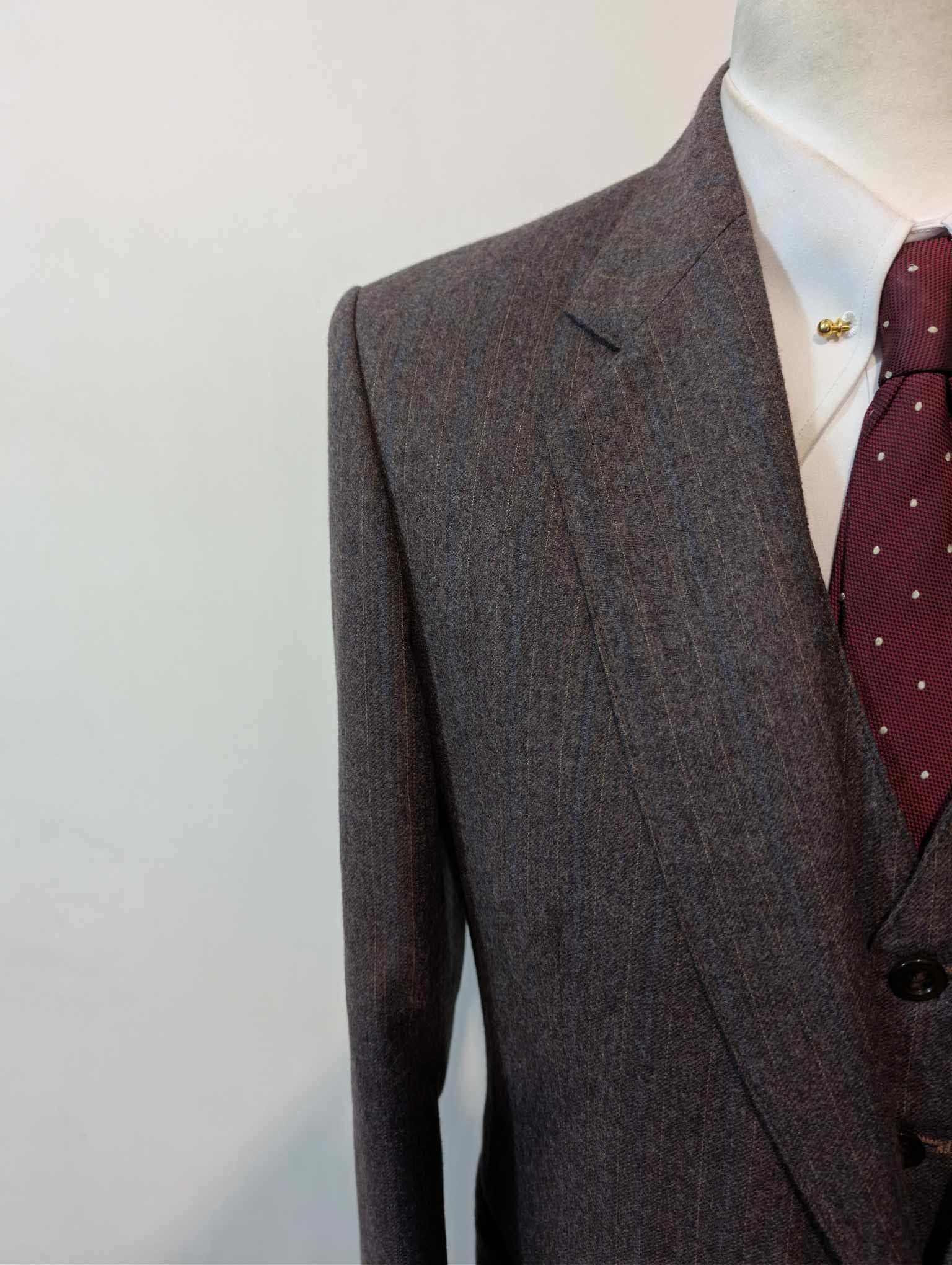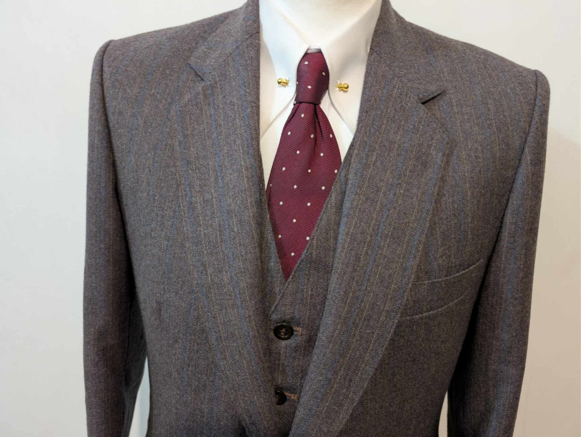 Je vous propose ce magnifique costume trois pièces de couleur gris violet à rayures bleu en flanelle de laine.