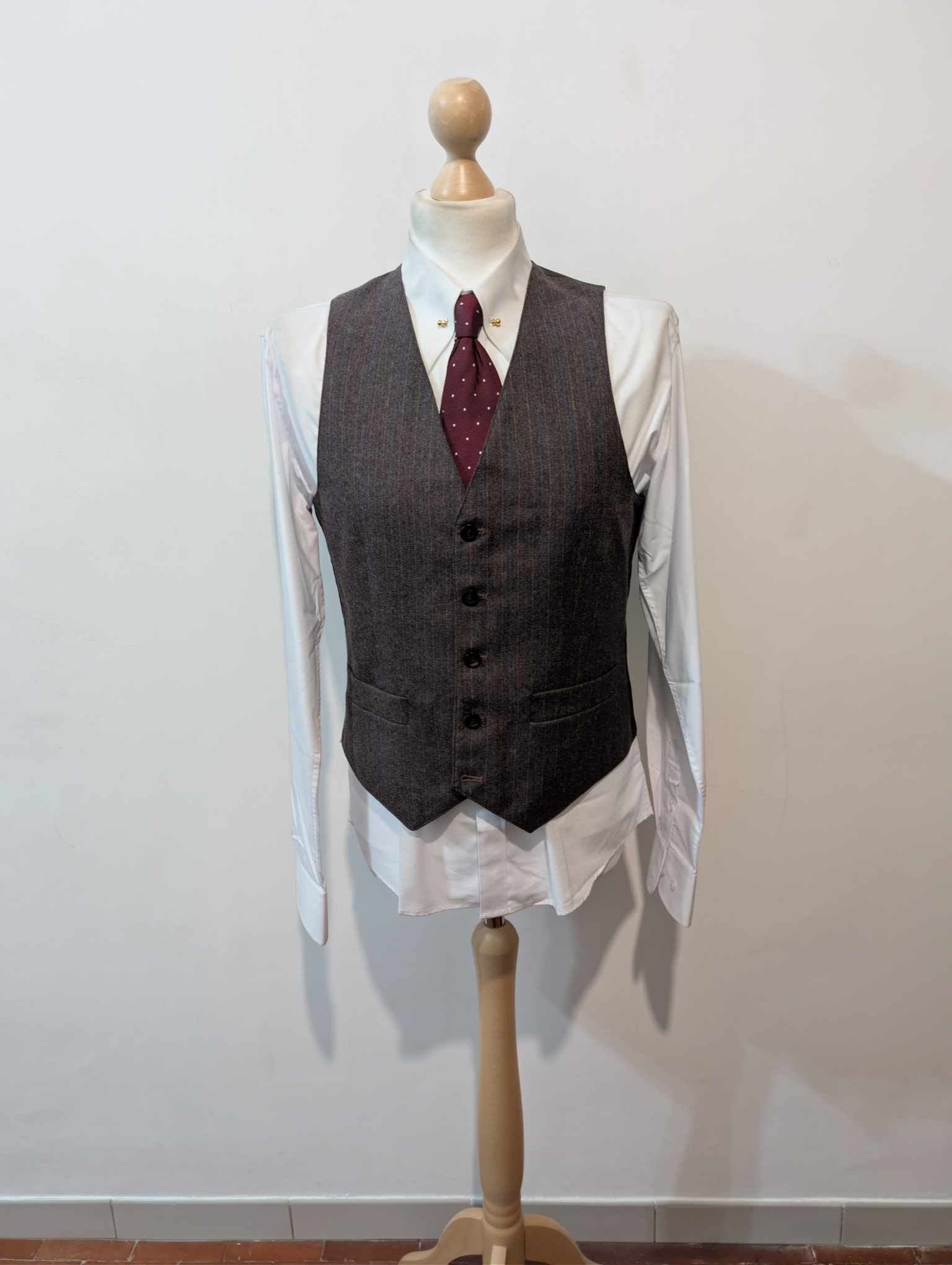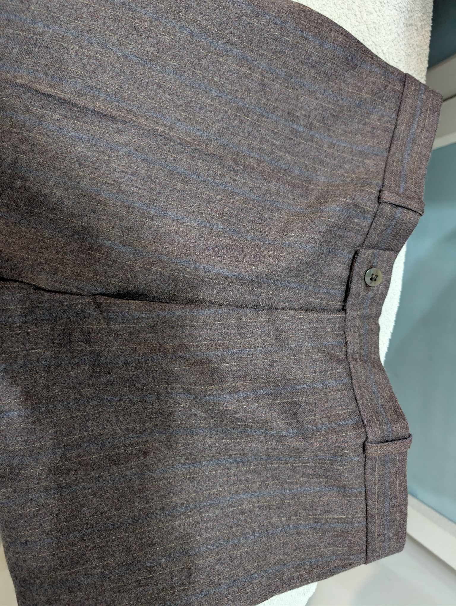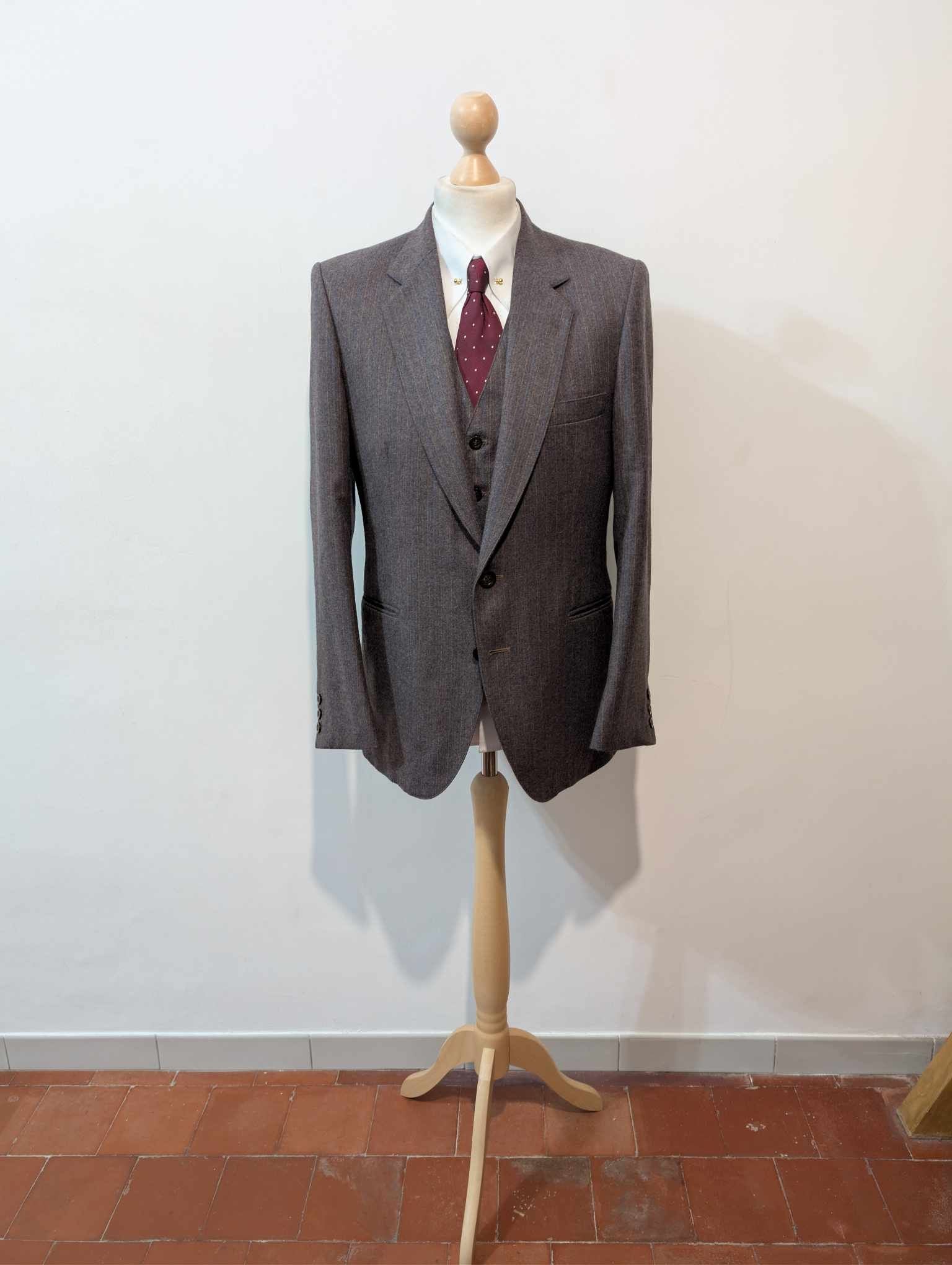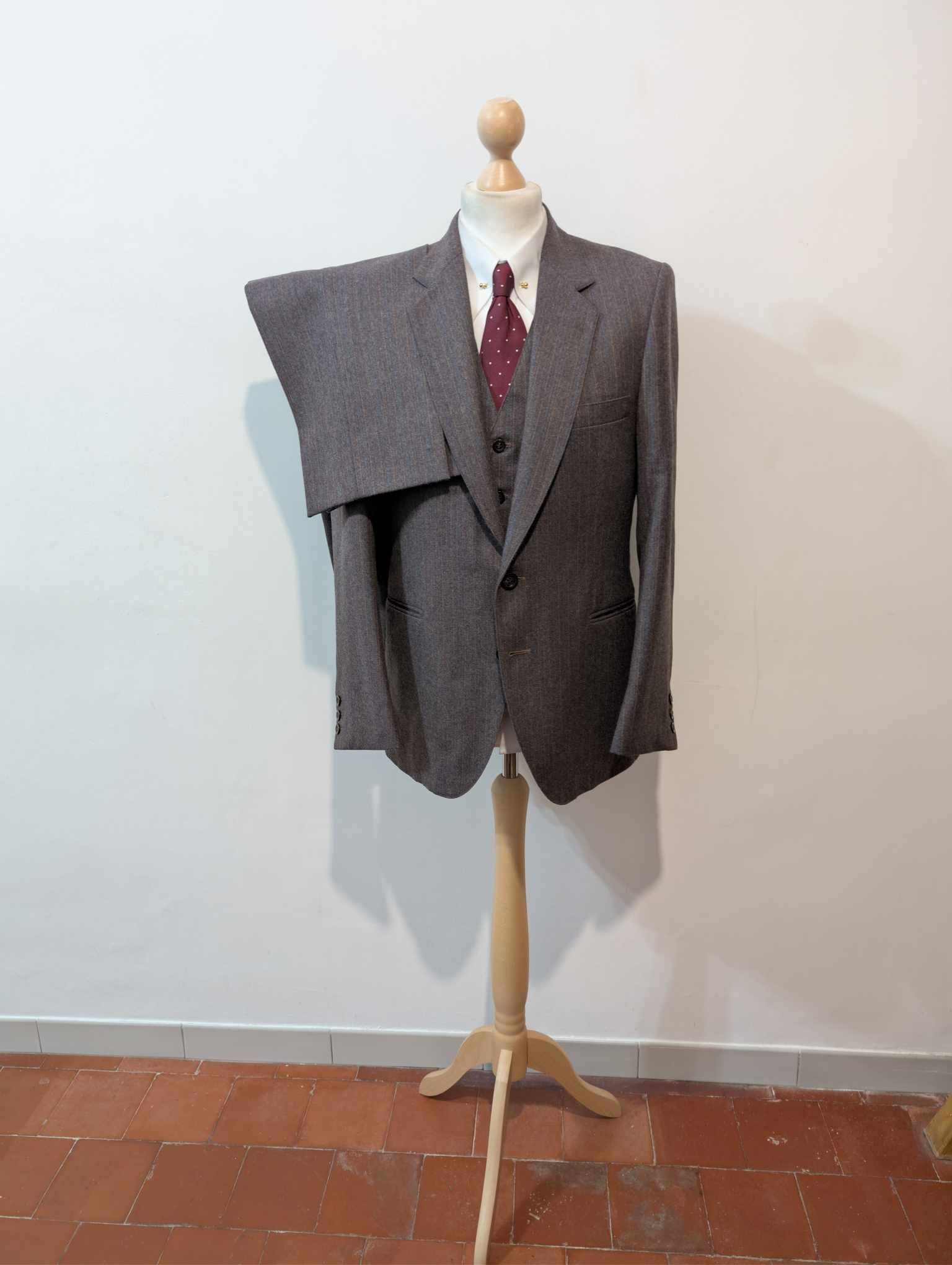 Je vous propose ce magnifique costume trois pièces de couleur gris violet à rayures bleu en flanelle de laine.