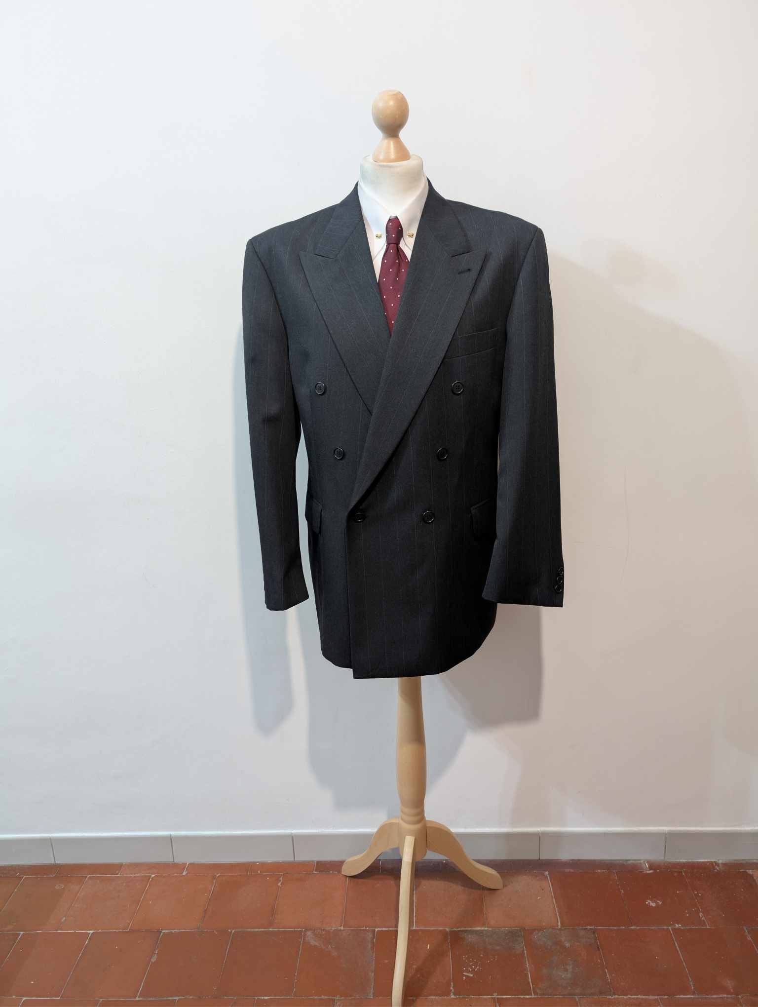 Je vous propose ce magnifique costume croisé pinstripe de couleur gris anthracite à rayures en laine.