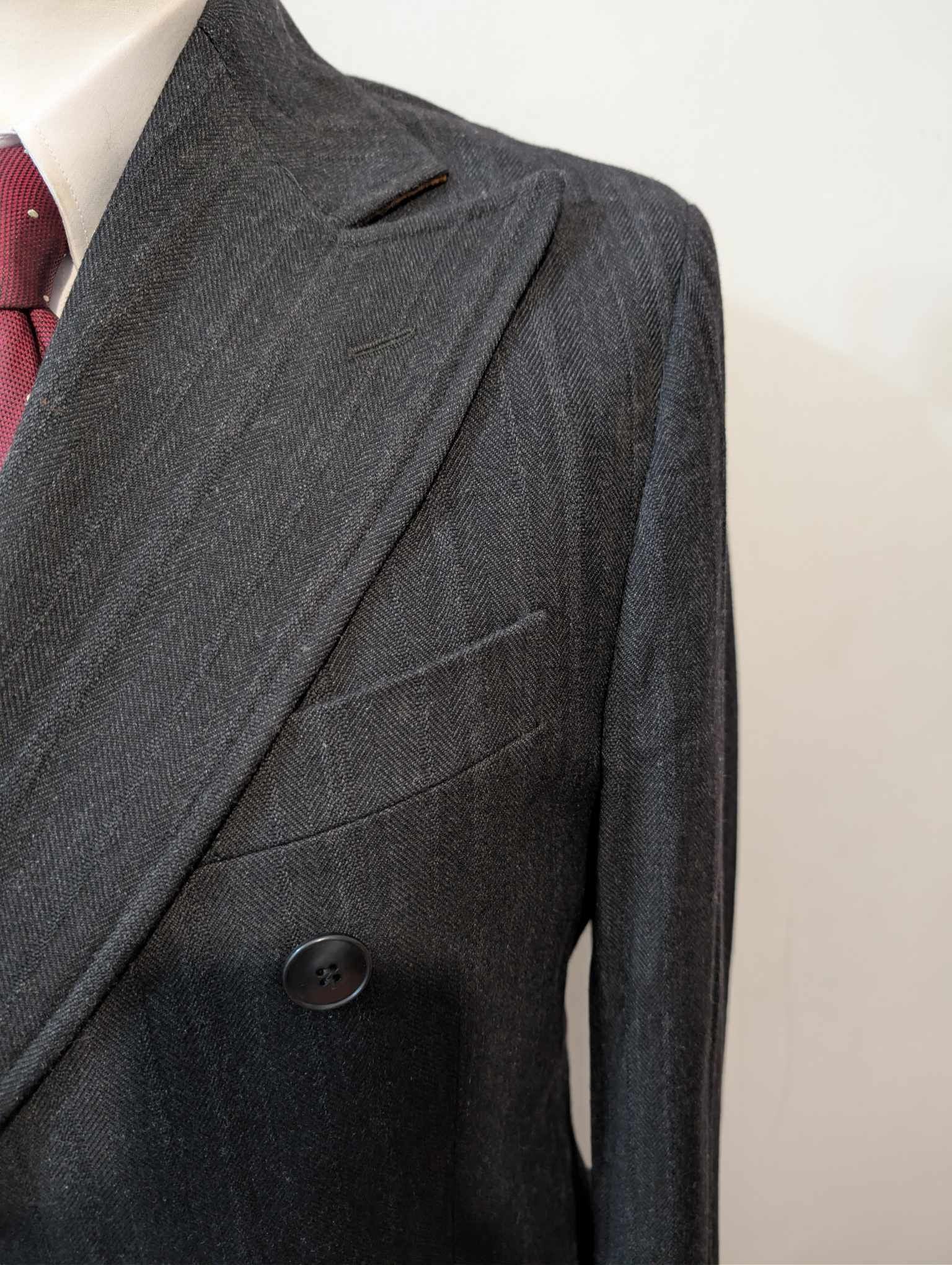 Je vous propose ce magnifique manteau croisé de couleur gris à motif chevron en laine.