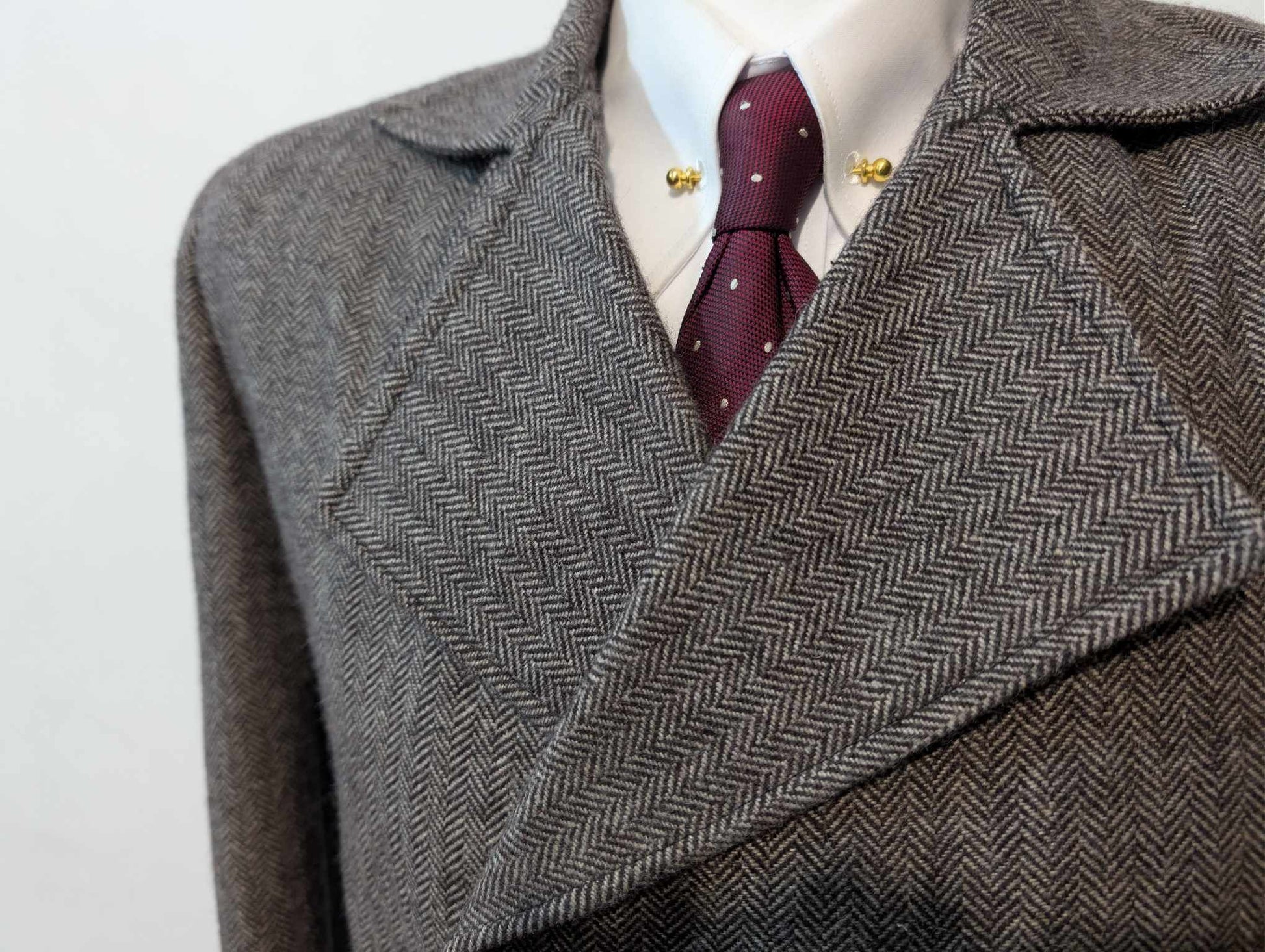 Je vous propose ce magnifique trench de couleur gris marron à motif chevron en tweed.