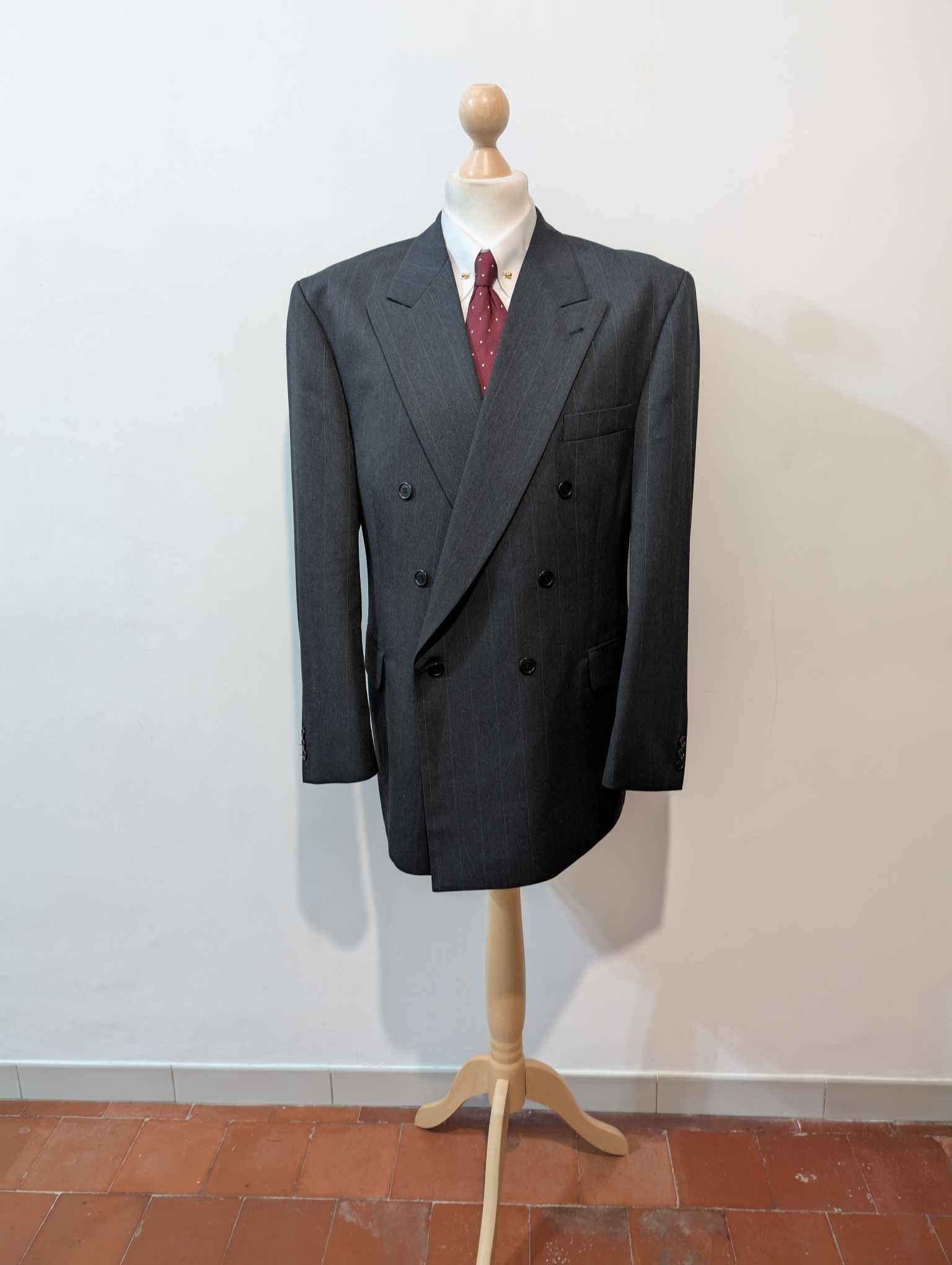 Je vous propose ce méchant costume croisé pinstripe de couleurs gris anthracite à fine rayures blanches en laine.