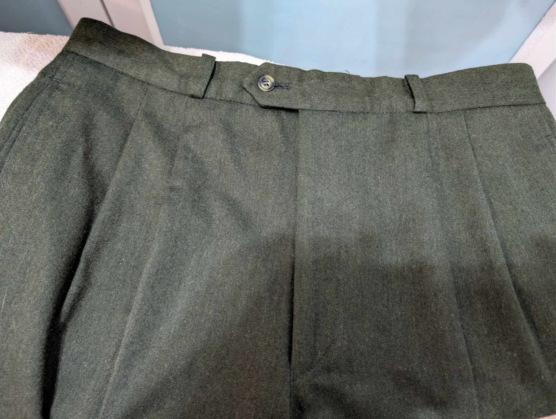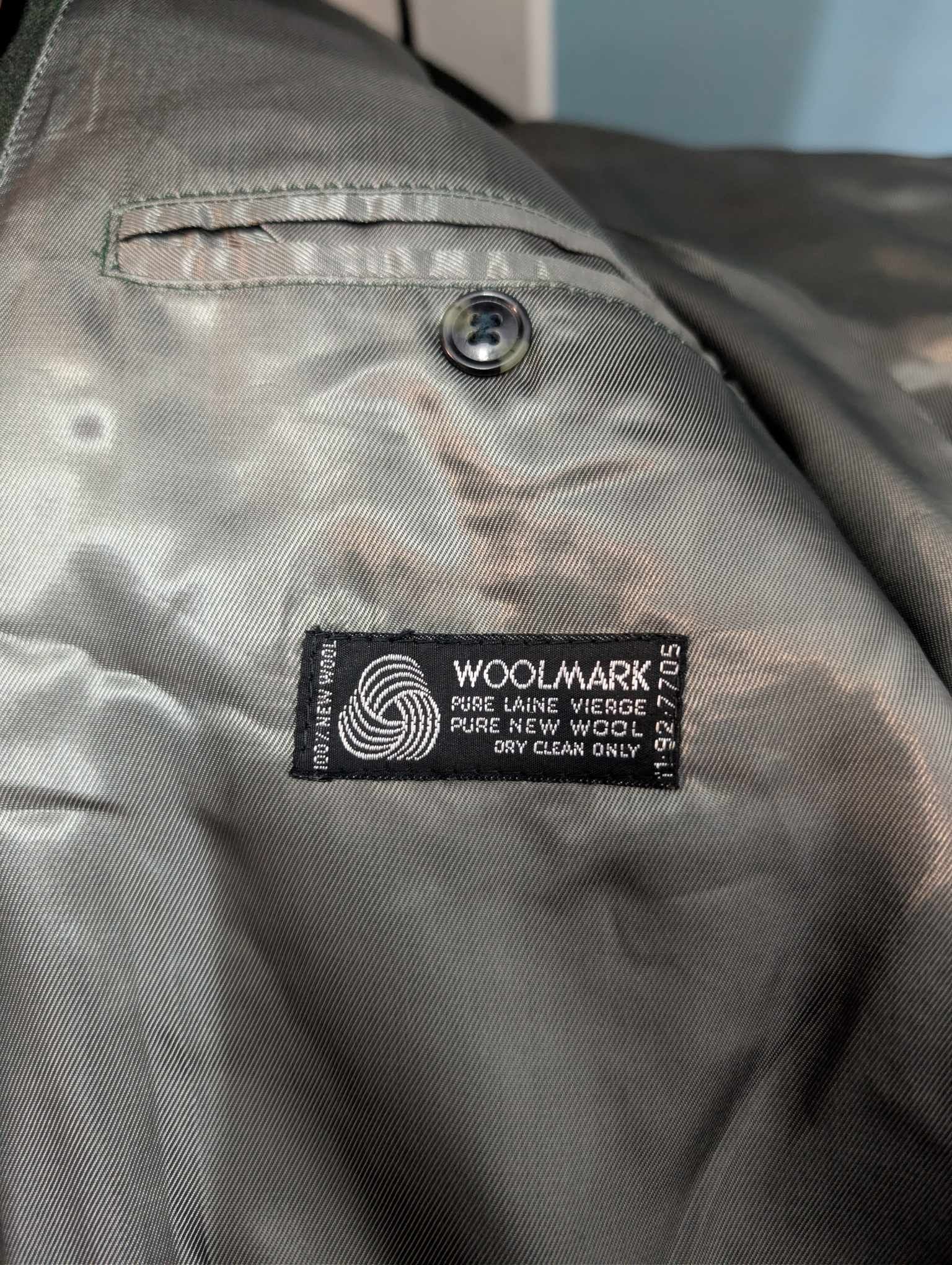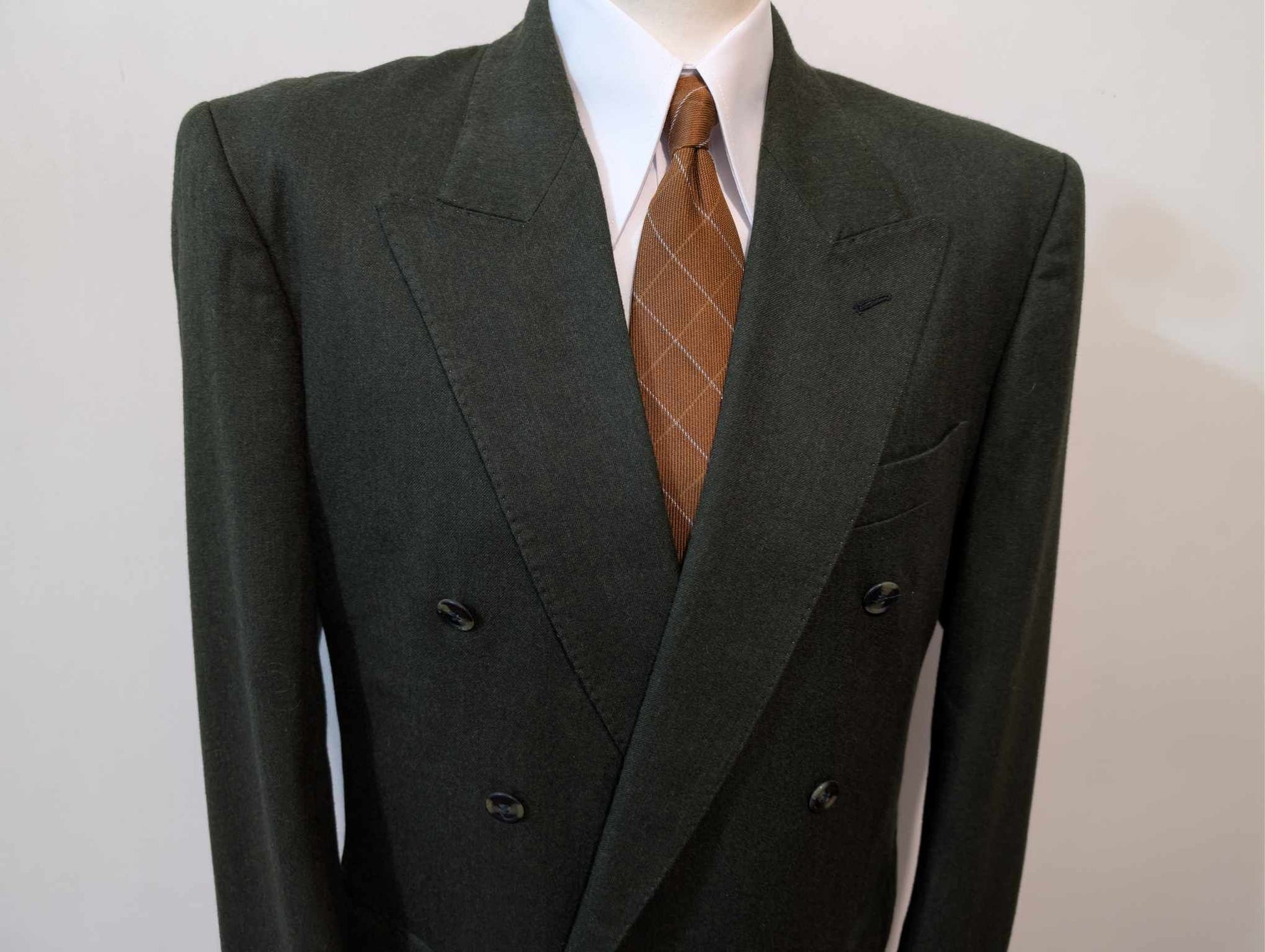 Je vous présente cet original costume croisé de couleur vert en flanelle de laine.