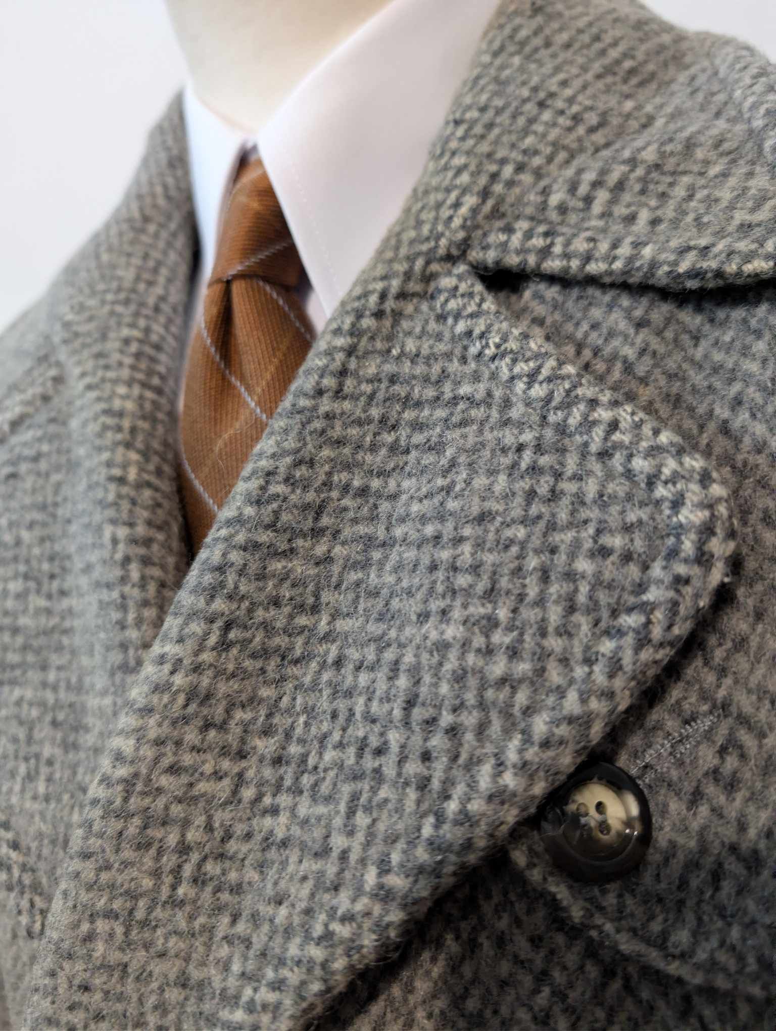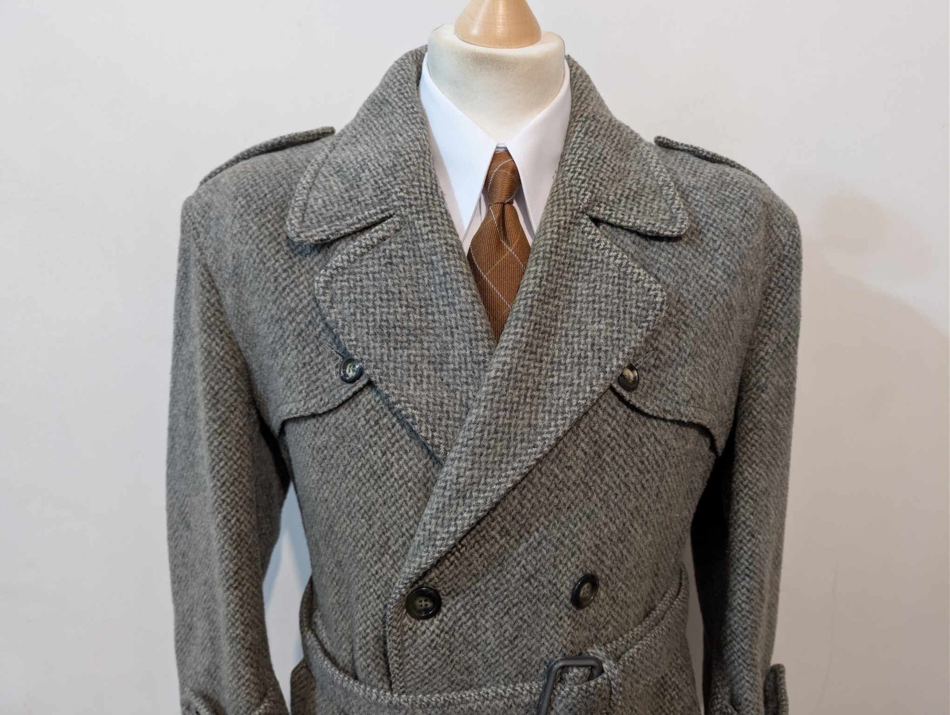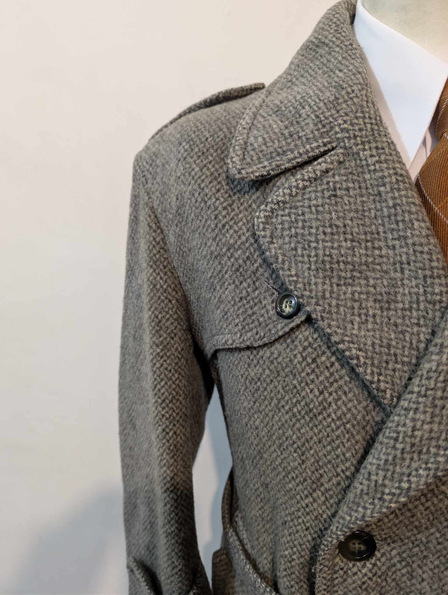 Je vous proposec e robuste trench coach de couleur gris à motif chevron en tweed.